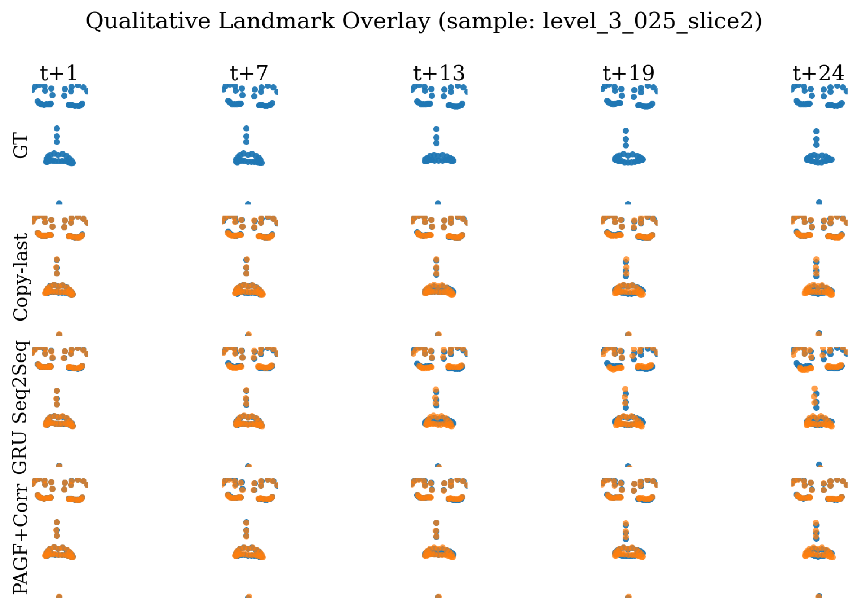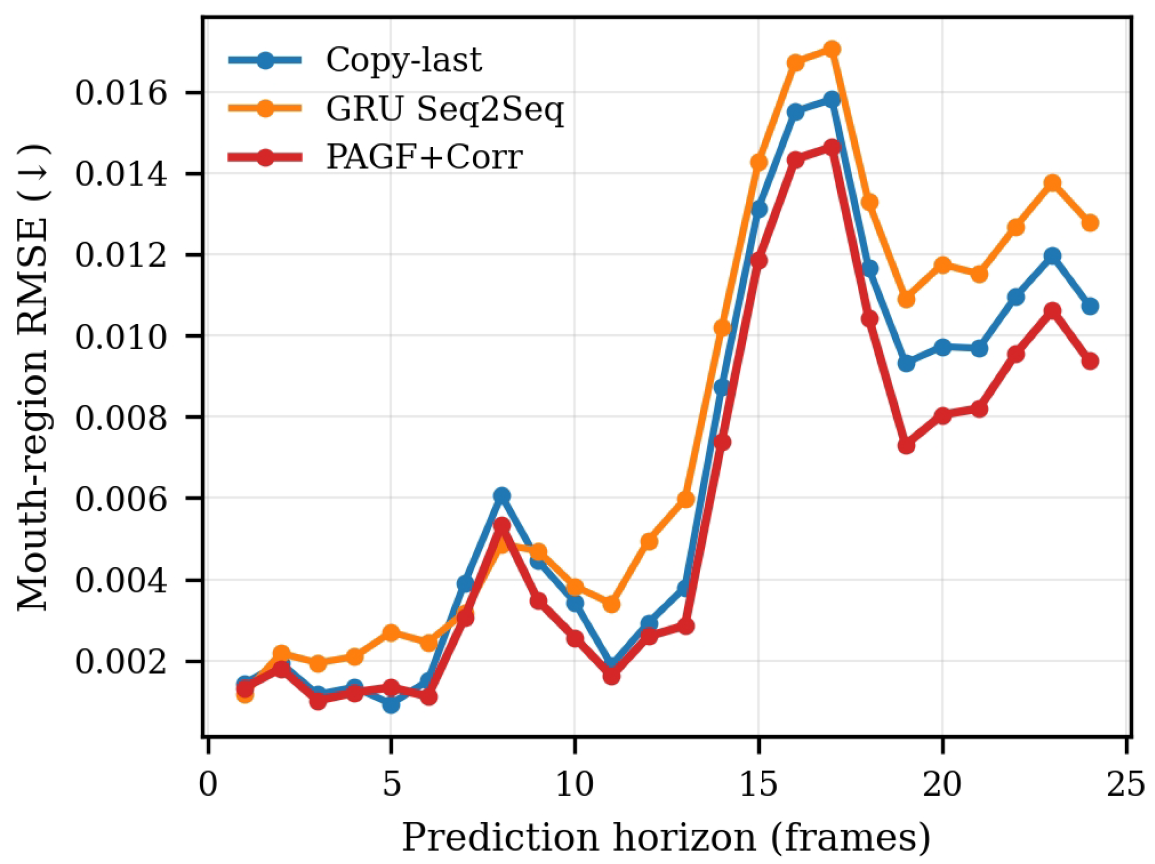 Figure 5, the Copy-Last baseline remains close to a static estimate and fails to capture the onset of the motion, while the generic Seq2Seq model initiates the movement but produces an attenuated peak, consistent with the over-smoothing tendency observed in the quantitative analysis. By contrast, PAGF+Corr more closely matches the ground-truth trajectory in both peak timing and motion magnitude, resulting in a more faithful temporal evolution of the expression. This tendency is further supported by