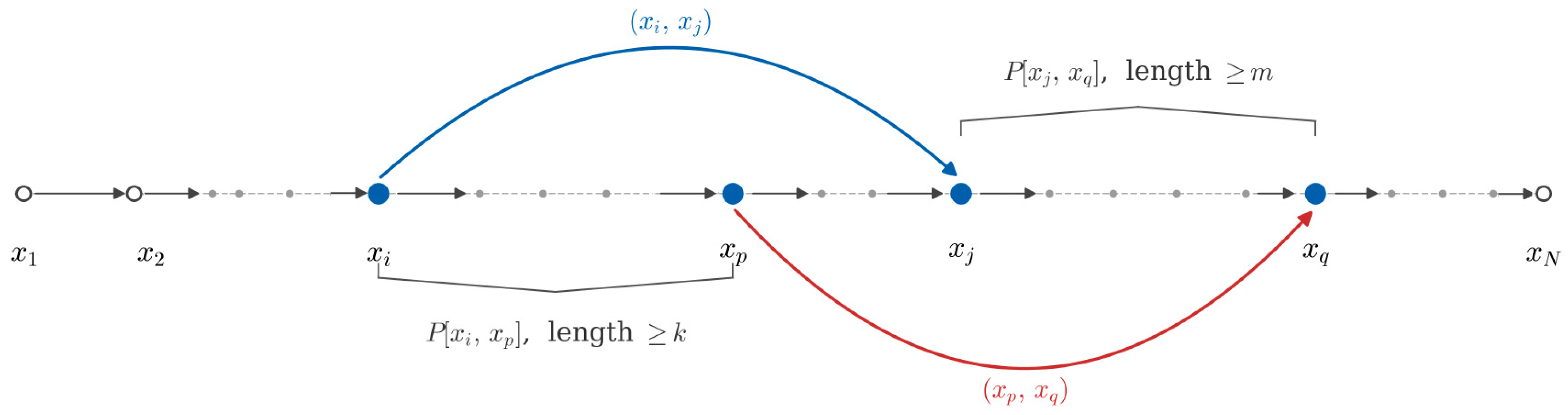 Definition 1. Suppose that is a linear ordering of the vertices of a graph G. Let k be a positive integer. An edge is called a k-jump with respect to L, if . It is said to contain an l-jump , if . It is said to be a minimal k-jump if it contains no k-jump other than itself.