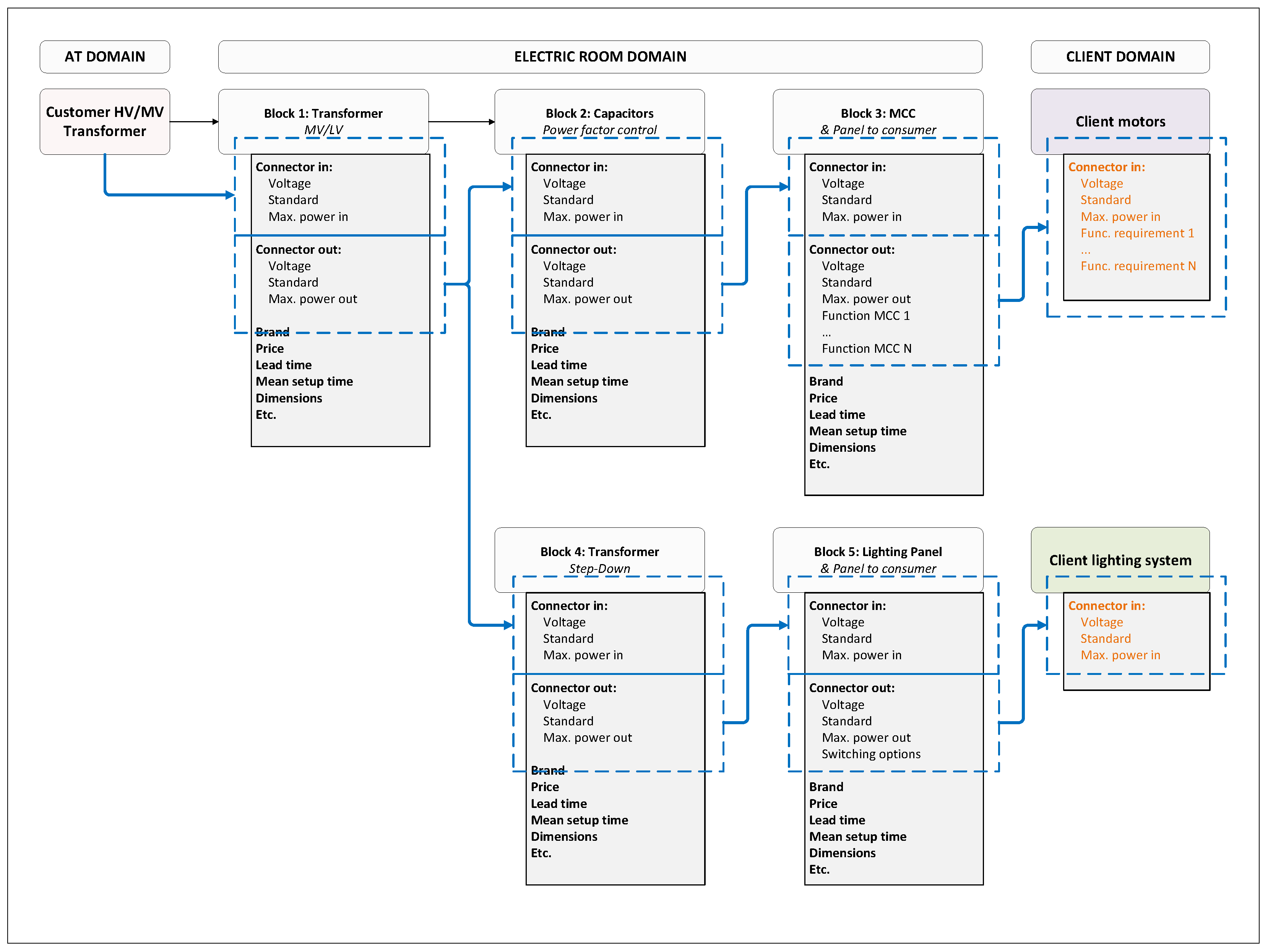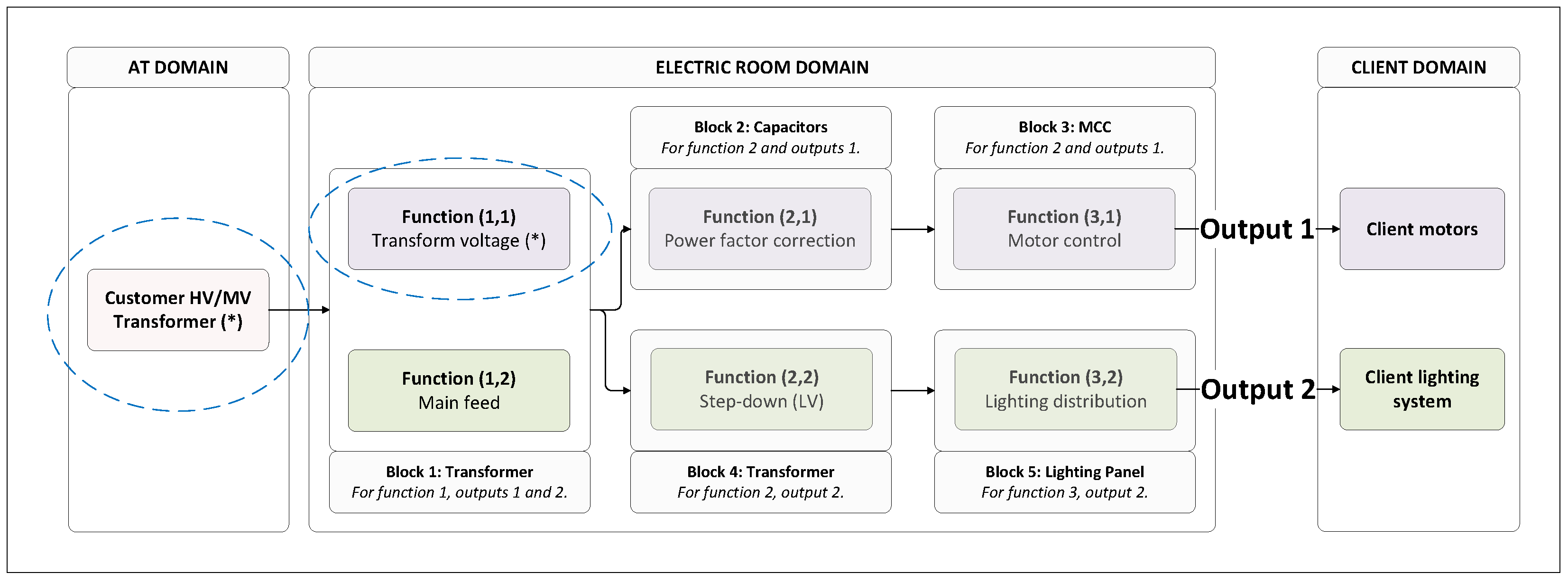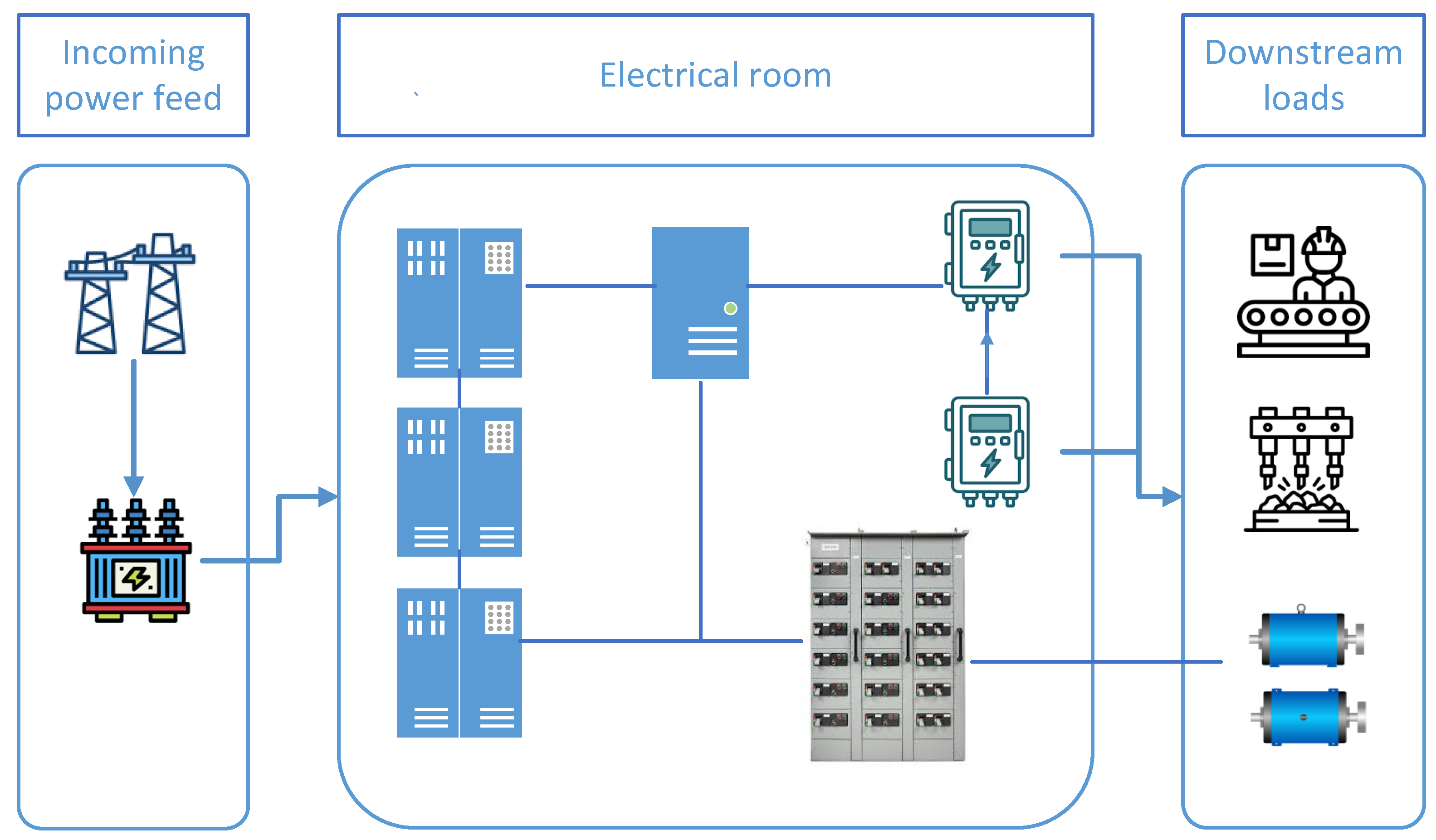 Figure 1 provides a preliminary black-box view of an electrical room from a systems standpoint: an incoming power feed is transformed and conditioned to supply downstream industrial loads. However, the internal structure of the electrical room remains implicit in that figure. Here we make the internal decomposition explicit because it is the basis for the data organization and the automation logic used later in the paper.