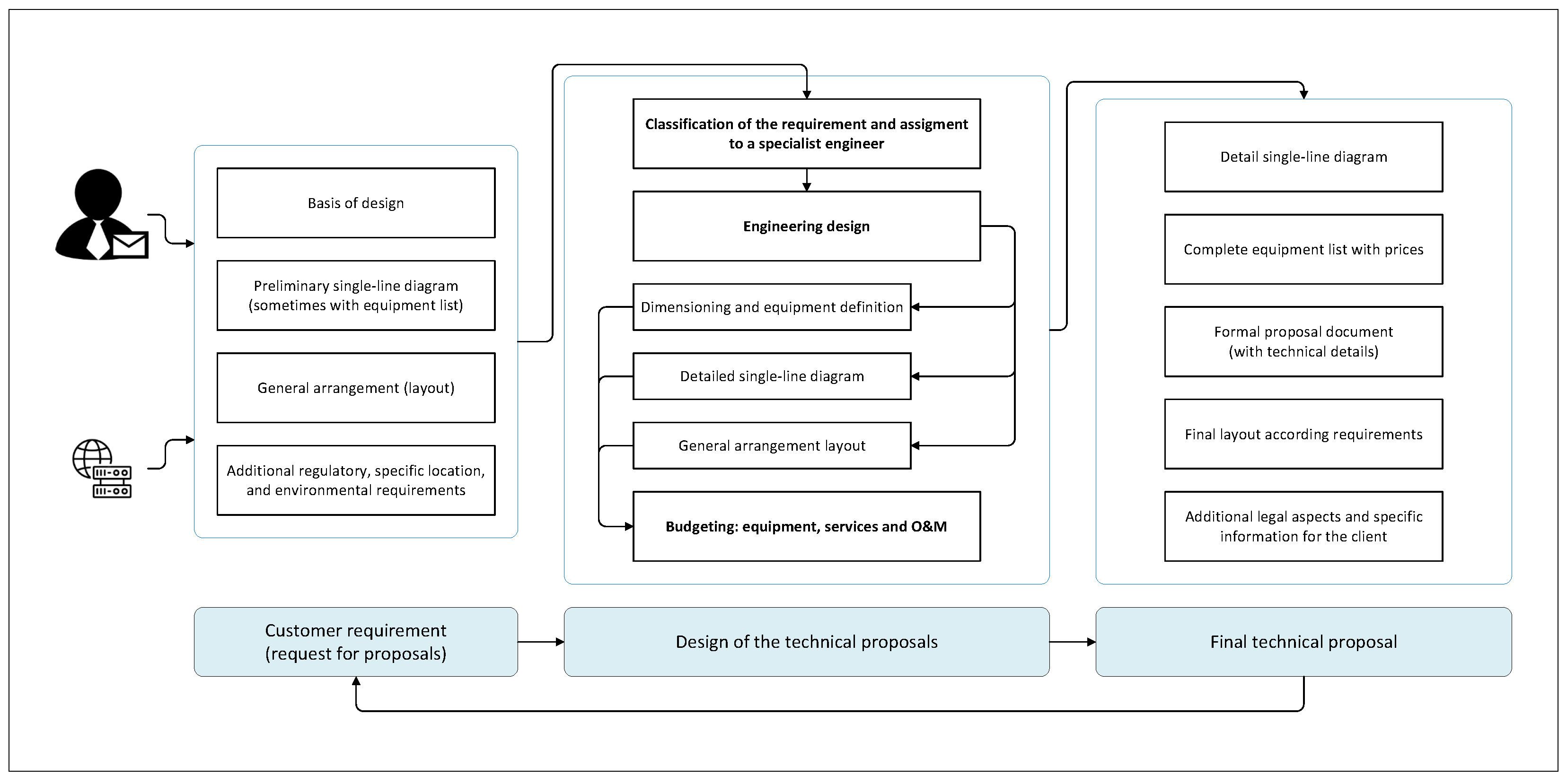 Figure 2 shows the workflow for the engineering design and technical proposal of electrical rooms. The diagram illustrates the end-to-end process starting from customer requirements (RFP), moving through the engineering design phase (including equipment sizing, development of electrical single-line diagrams (SLDs), and general arrangement (GA) layout organization), and culminating in the delivery of a complete technical offer, including detailed SLDs, equipment lists (BOM), and formal proposal documentation.