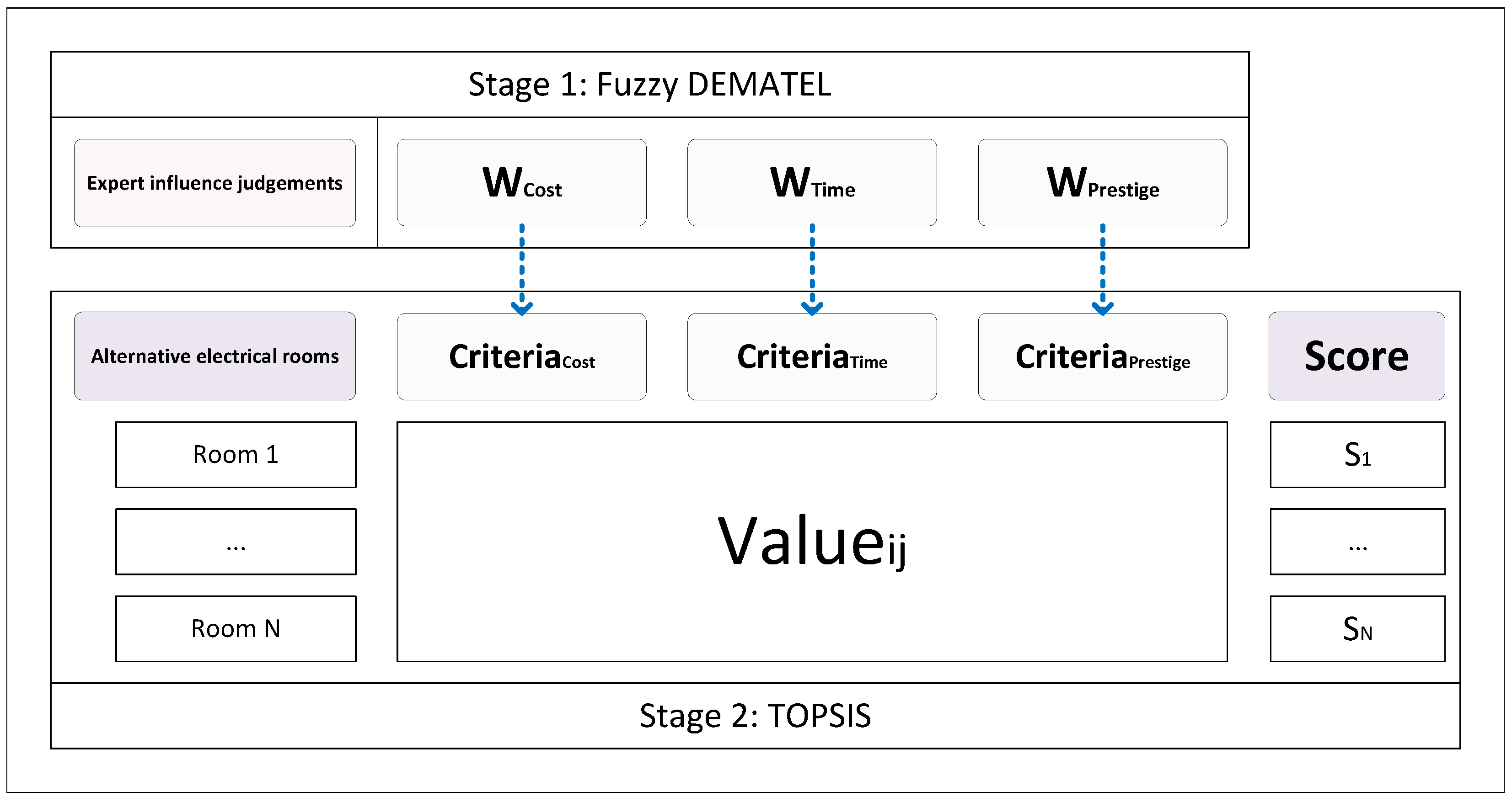 The output of this stage is the weight vector , which is then used by TOPSIS to rank the feasible electrical room alternatives.
