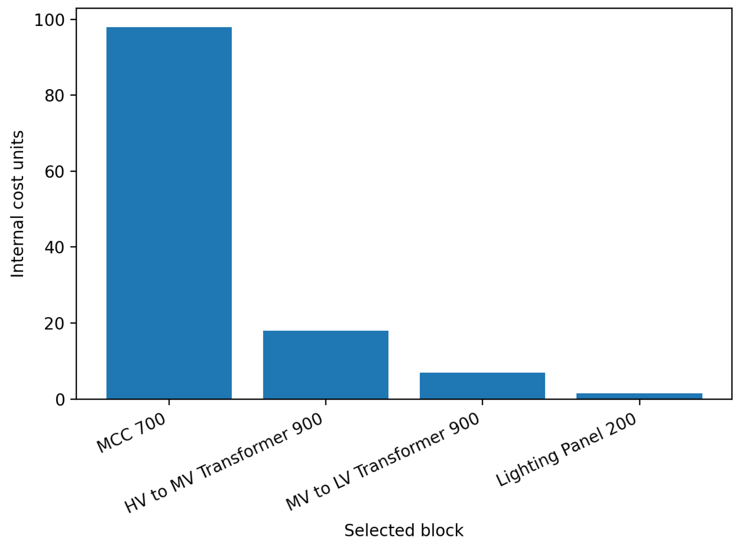 Table 2 reports the selected blocks and their capacity usage. The HV to MV transformer and the MV to LV transformer are shared by both outputs because both outputs require the same upstream functions. Each of these transformers has a capacity of 900 kVA and is assigned a total load of 850 kVA, which corresponds to 94.4 percent utilization. The motor control block is an MCC with capacity 700 kVA, assigned load 700 kVA, and therefore 100.0 percent utilization. The lighting panel has capacity 200 kVA, assigned load 150 kVA, and therefore 75.0 percent utilization.