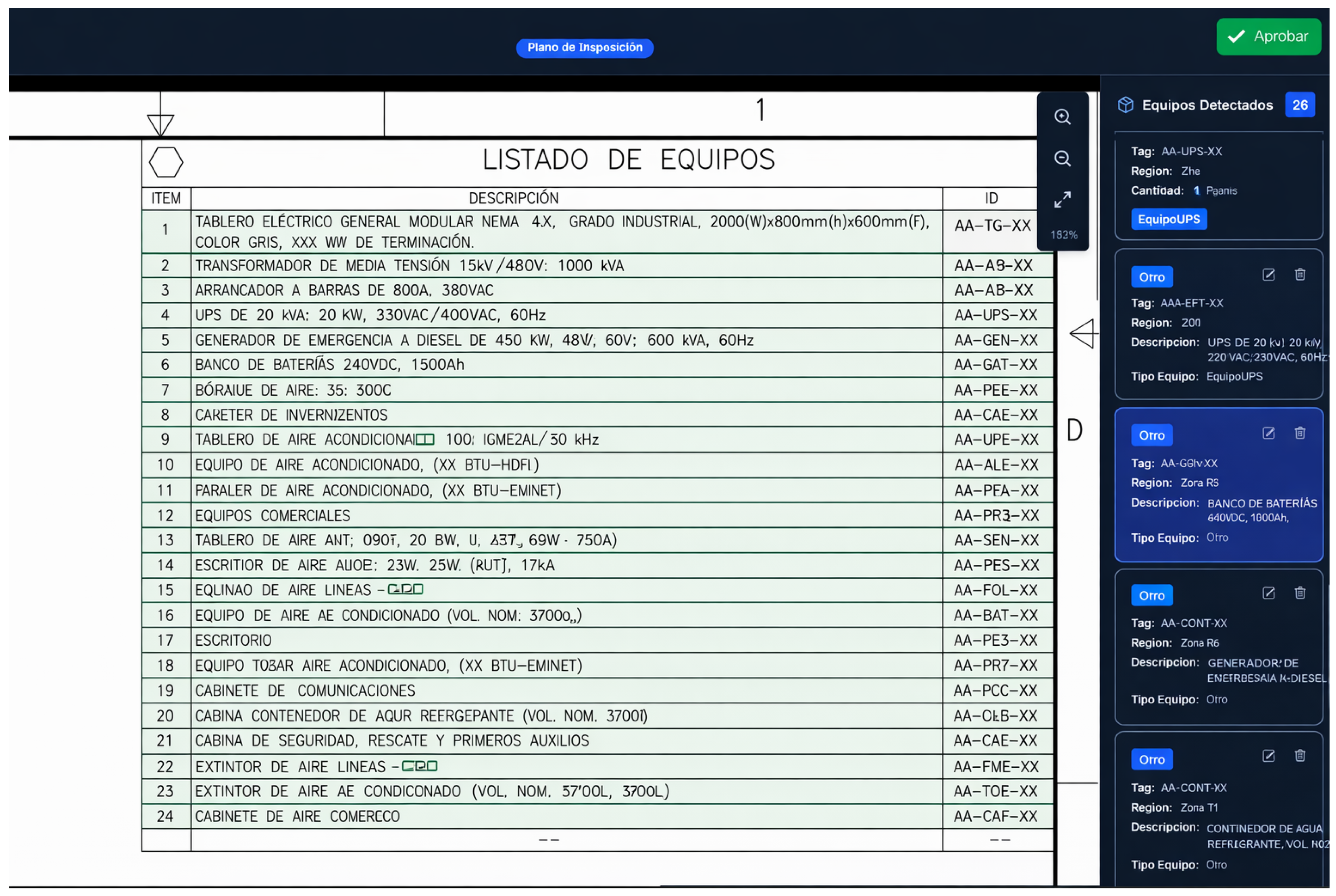 Figure 8 shows an example based on a disposition plan. The left side displays the source document, while the right side reports the extracted items as a table with equipment identifier, quantity, description, and equipment type. The user can review the extracted list, correct individual fields if needed, and approve the result. This review step is intentional. It keeps the human engineer in control of the structured data that will later be used as input for proposal generation, and it preserves traceability from the structured list back to the original document.