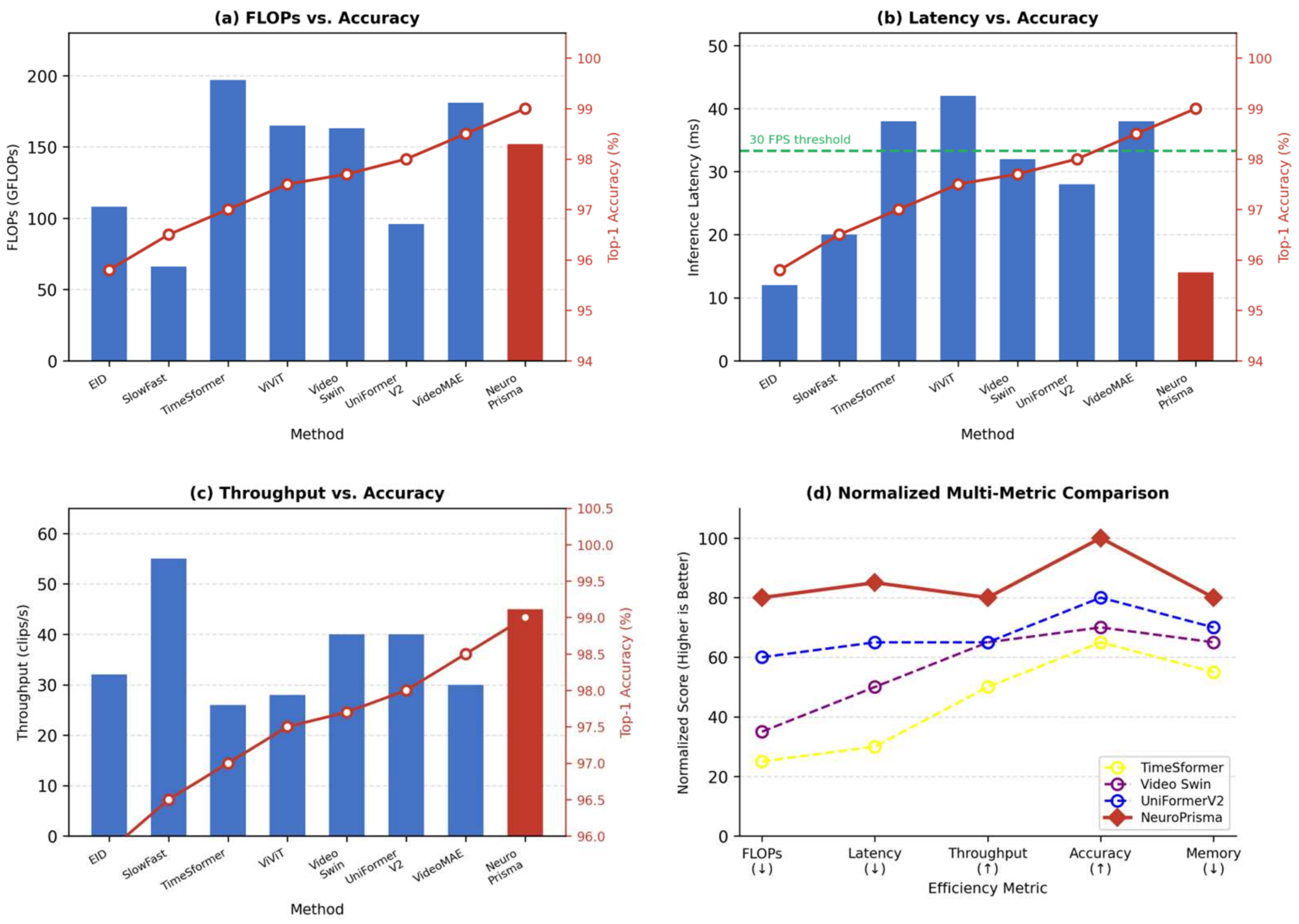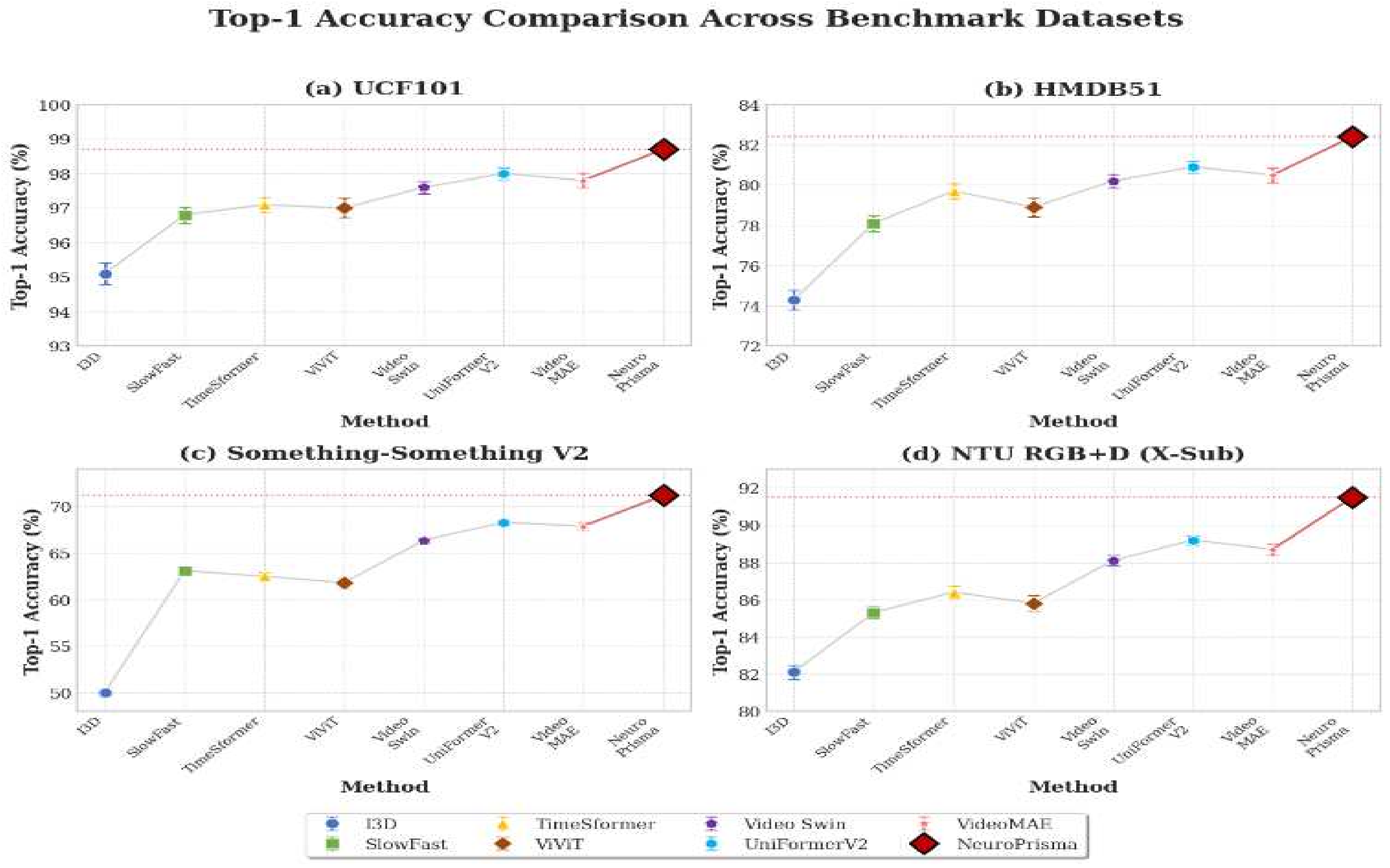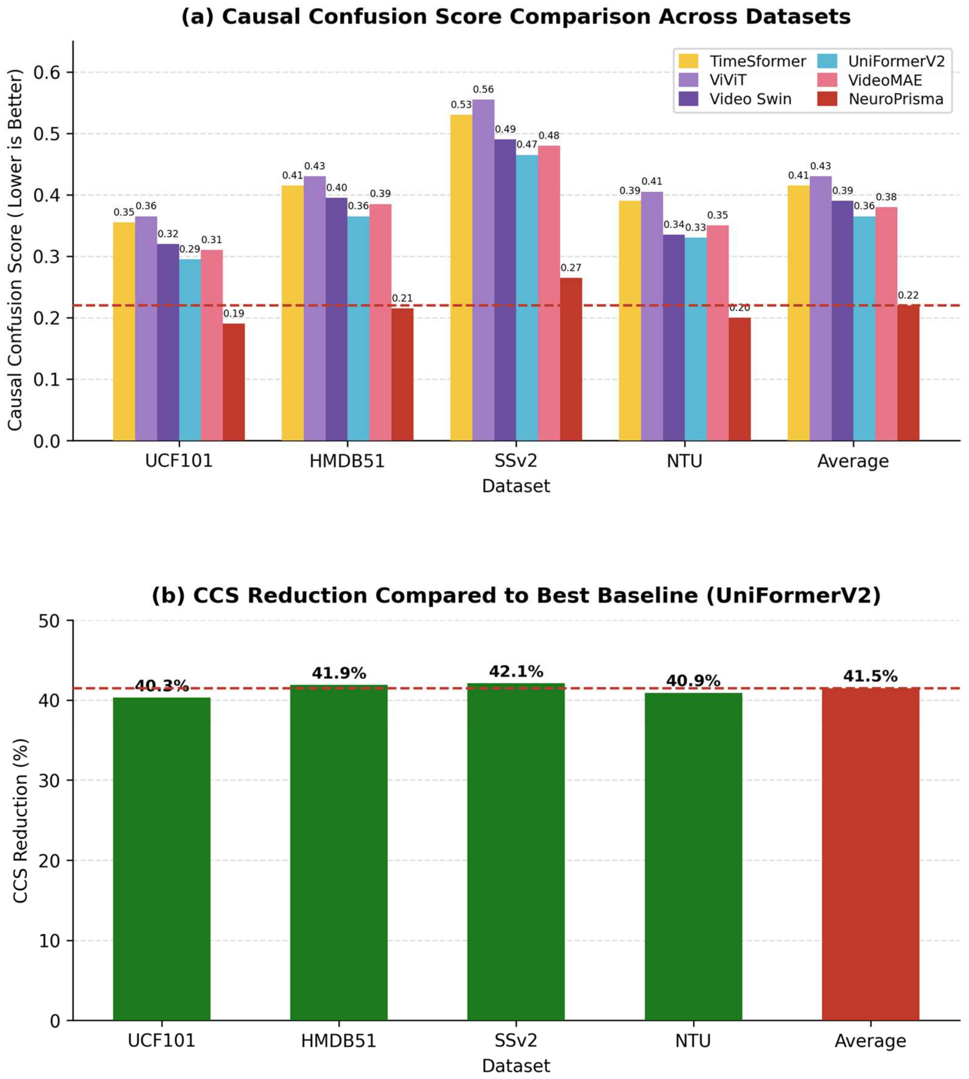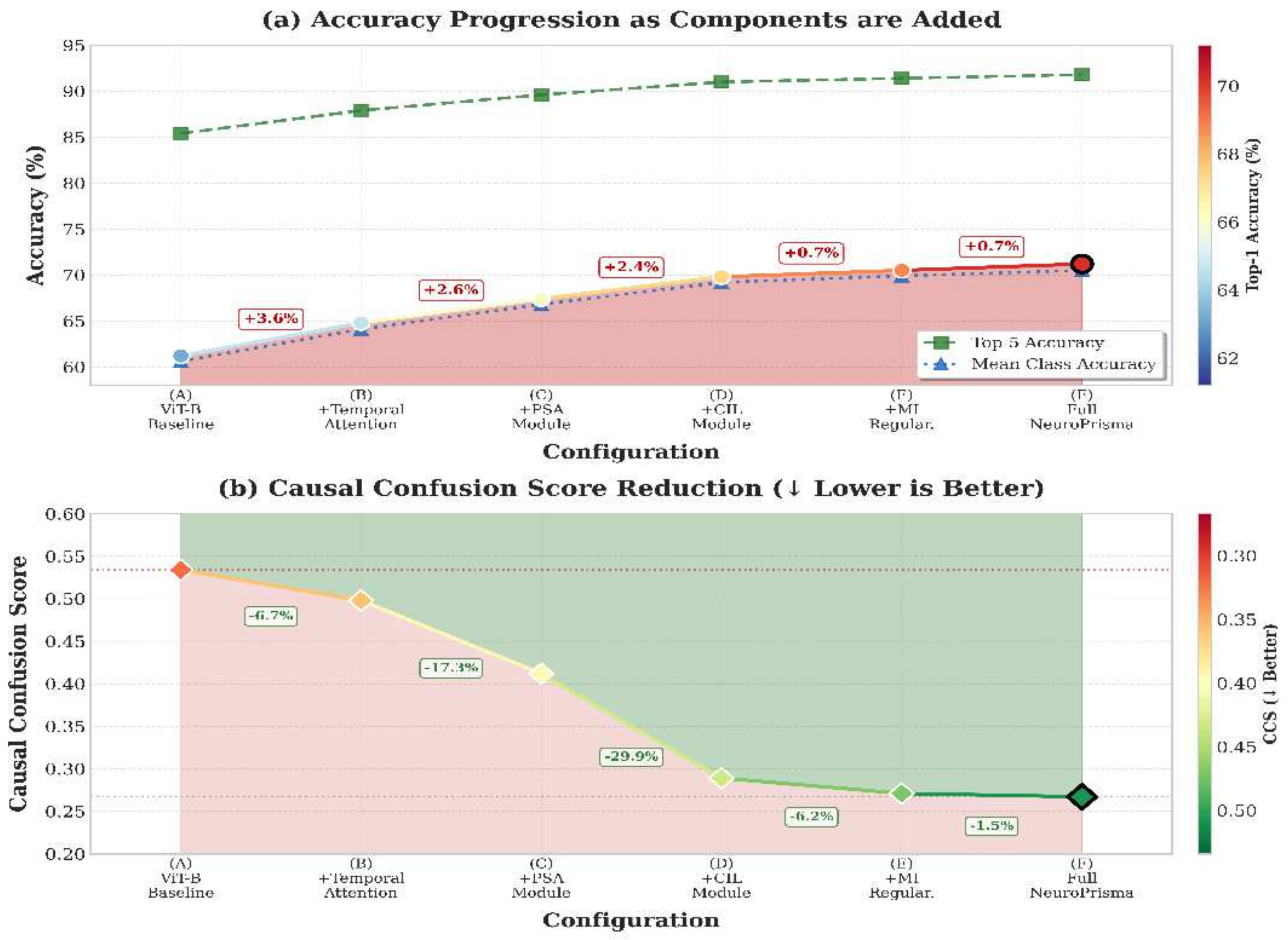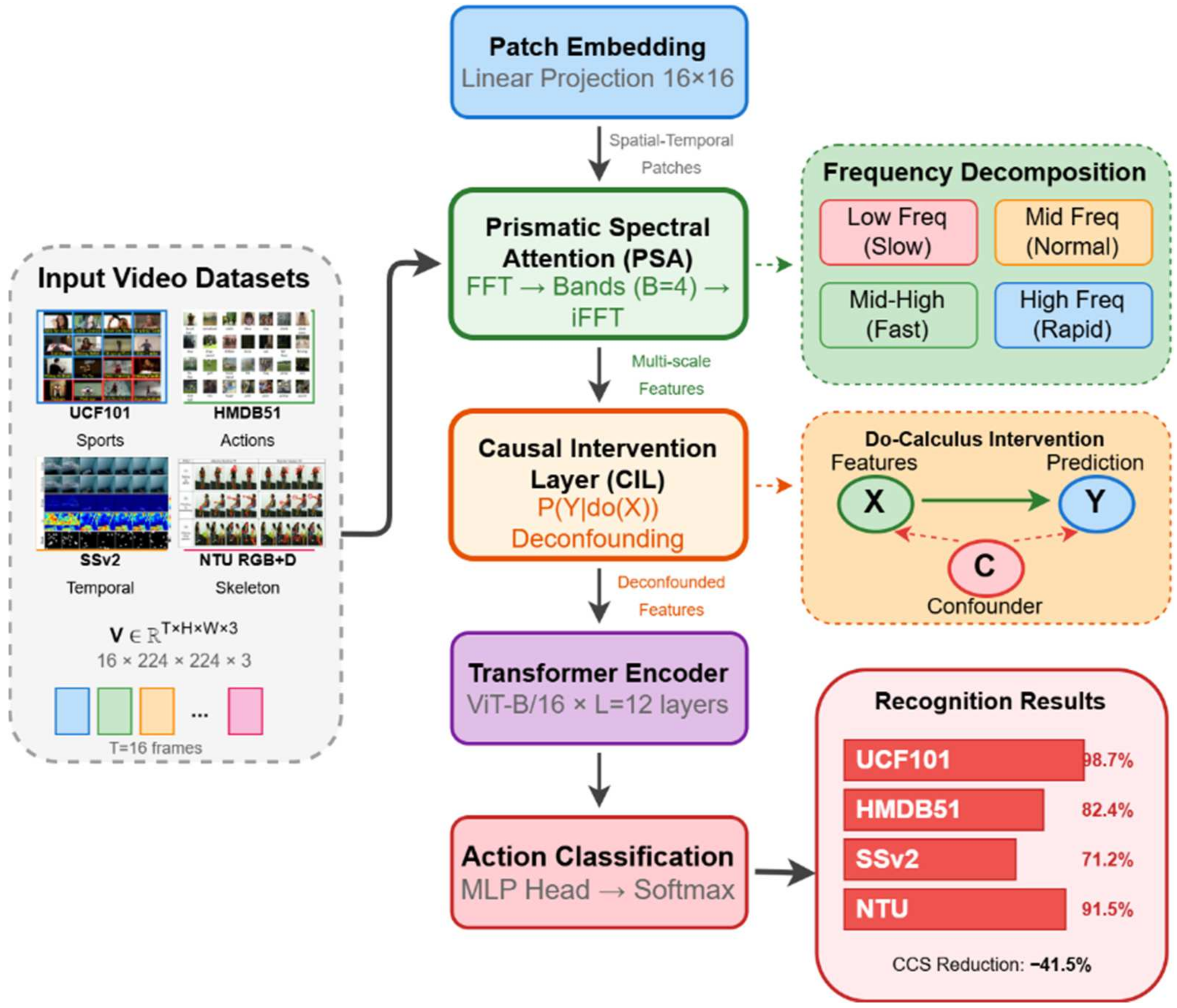 NeuroPrisma is a research prototype demonstrating potential for causality-aware action recognition in neural rehabilitation systems, grounded in frequency-domain spectral decomposition (Prismatic Spectral Attention module) and Structural Causal Model-based intervention (Causal Intervention Layer). Extensive evaluation on four benchmark datasets demonstrated state-of-the-art accuracies: 98.7% on UCF101, 82.4% on HMDB51, 71.2% on Something-Something V2, and 91.5%/95.8% on NTU RGB+D (Cross-Subject/Cross-View), with a 41.5% Causal Confusion Score reduction relative to UniFormerV2. All improvements are statistically significant (p < 0.001, Bonferroni-corrected, Cohen’s d = 0.72–1.24). Real-time latency: 23.4 ms (NVIDIA A100) and 67.3 ms (Jetson AGX Orin). Causal metrics: ATE +0.142 (SSv2), and CBER 52.8%. Synergy analysis shows 26.6% of performance gains arise from PSA-CIL interaction.