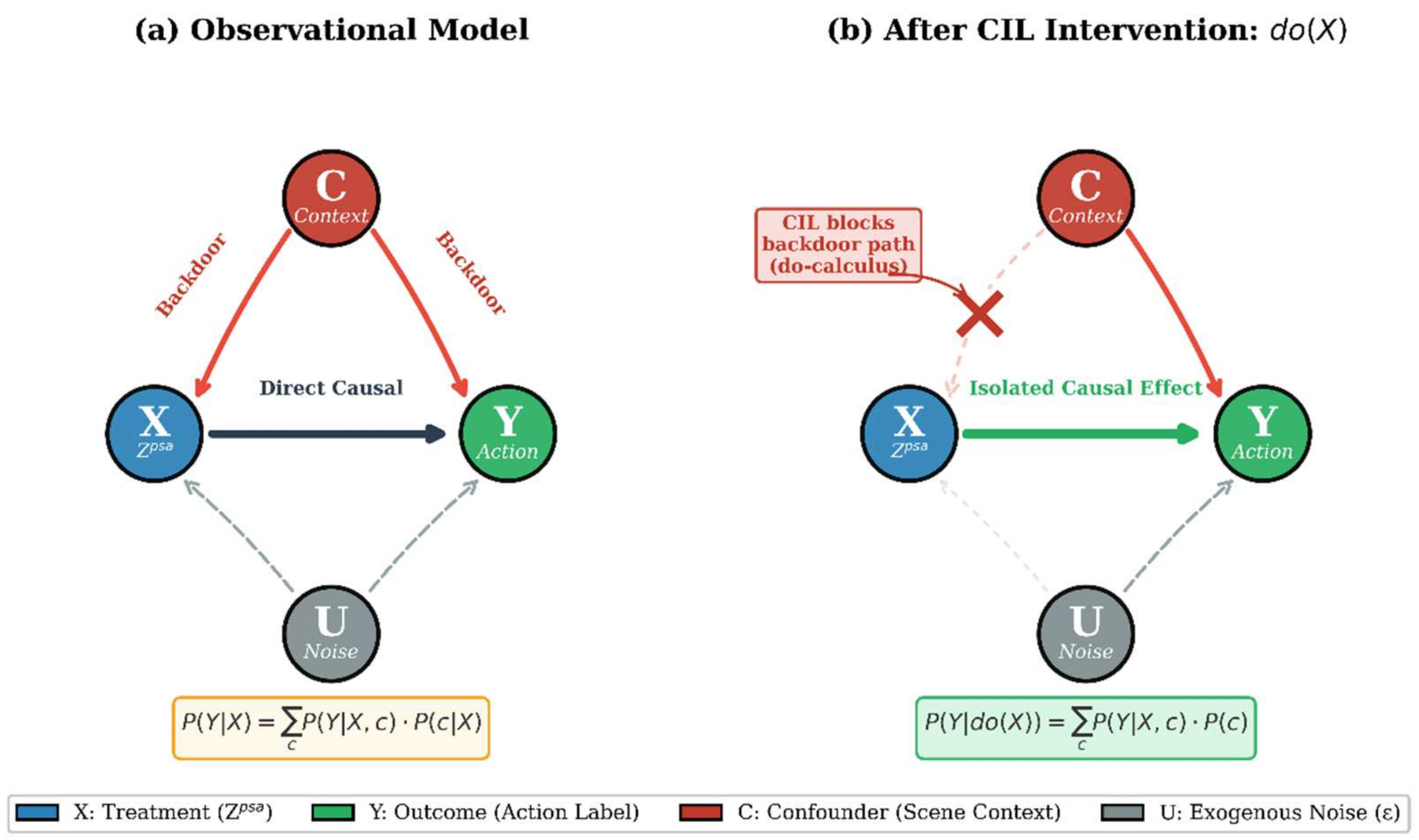 Causal Intervention Layer (CIL): A differentiable backdoor-adjustment module maintaining learnable confounder prototypes and applying NWGM-approximated do-calculus intervention to produce causally invariant action representations.