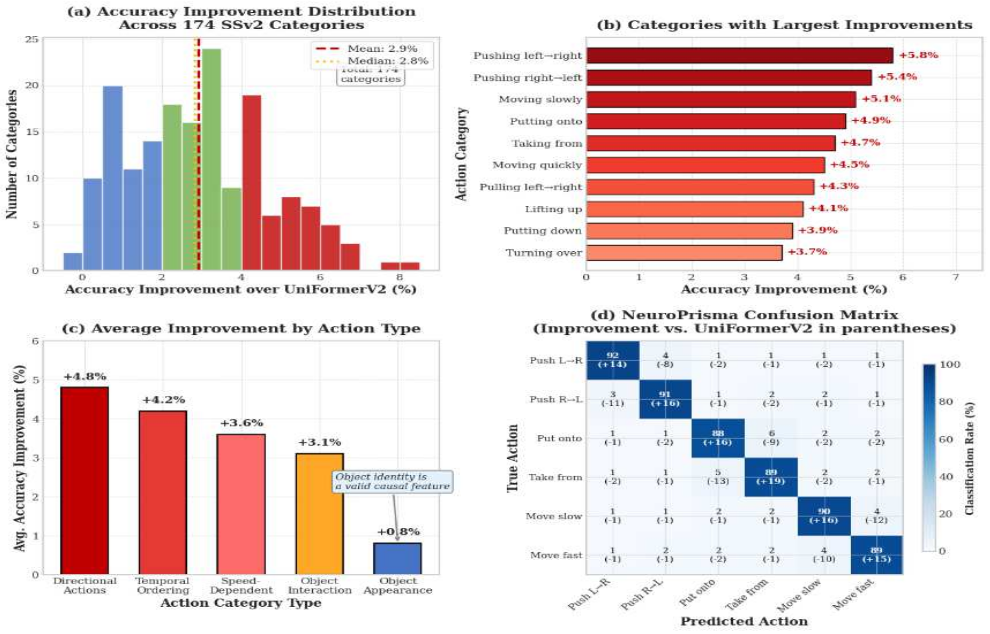 Figure 9, per-category analysis on SSv2. (a) Distribution of accuracy improvement across 174 SSv2 categories relative to UniFormerV2, with a mean gain of 2.9% and a median of 2.8%, indicating consistent improvements across the majority of categories. (b) Categories with the most substantial gains, which mainly involve differences in the fine-grained temporal aspects, such as directional and relational motion actions (e.g., “Pushing left → right,” “Moving slowly”). (c) Average accuracy improvement grouped by action type, showing that directional actions benefit most (+4.8%), while object appearance-based categories show minimal gain (+0.8%), suggesting that object identity is not a dominant causal feature in NeuroPrisma’s predictions. (d) NeuroPrisma confusion matrix for the six most temporally similar action categories, with per-cell improvement over UniFormerV2 shown in parentheses, demonstrating lower inter-category confusion and stronger discrimination of temporally similar actions.