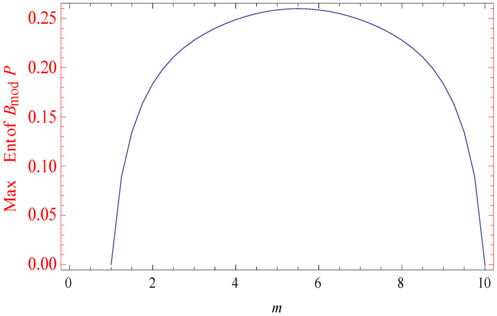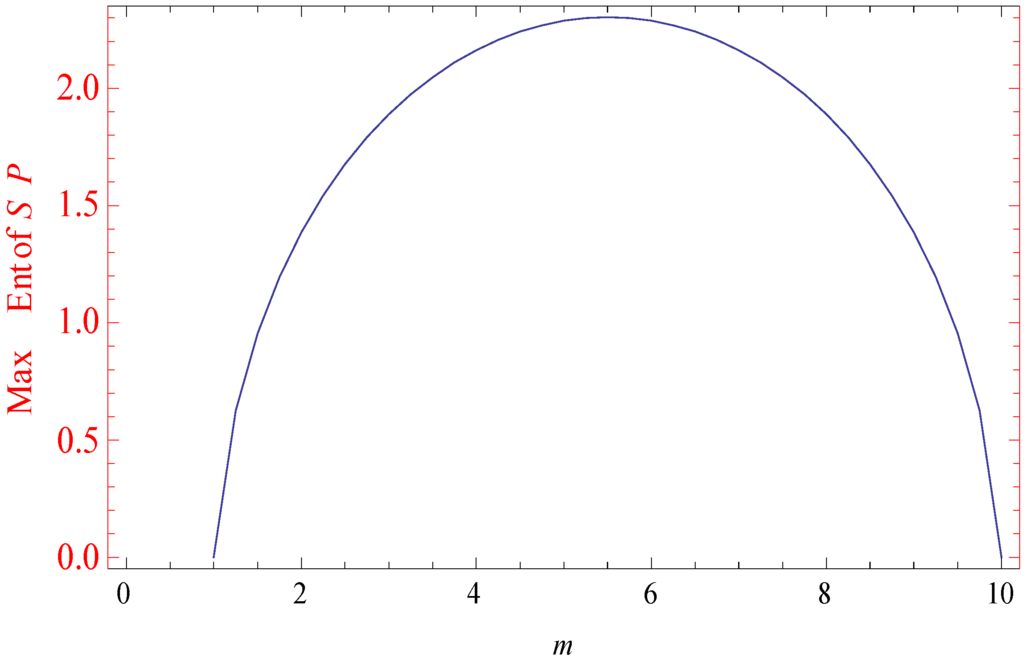 The measure of entropy is the Burg’s modified entropy. This is a better measure than the standard Burg’s measure since it is always positive and there is no computational problem when is very small. In the above case, the maximum value increases with the number of possible outcomes .