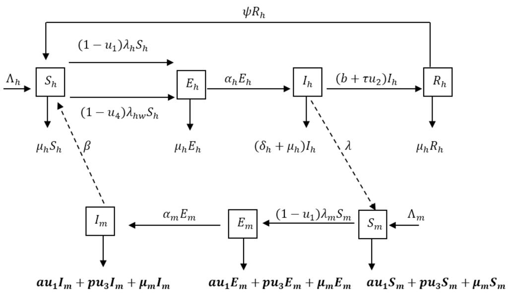 Figure 1 describes the dynamics of malaria in human and mosquito populations together with interventions.