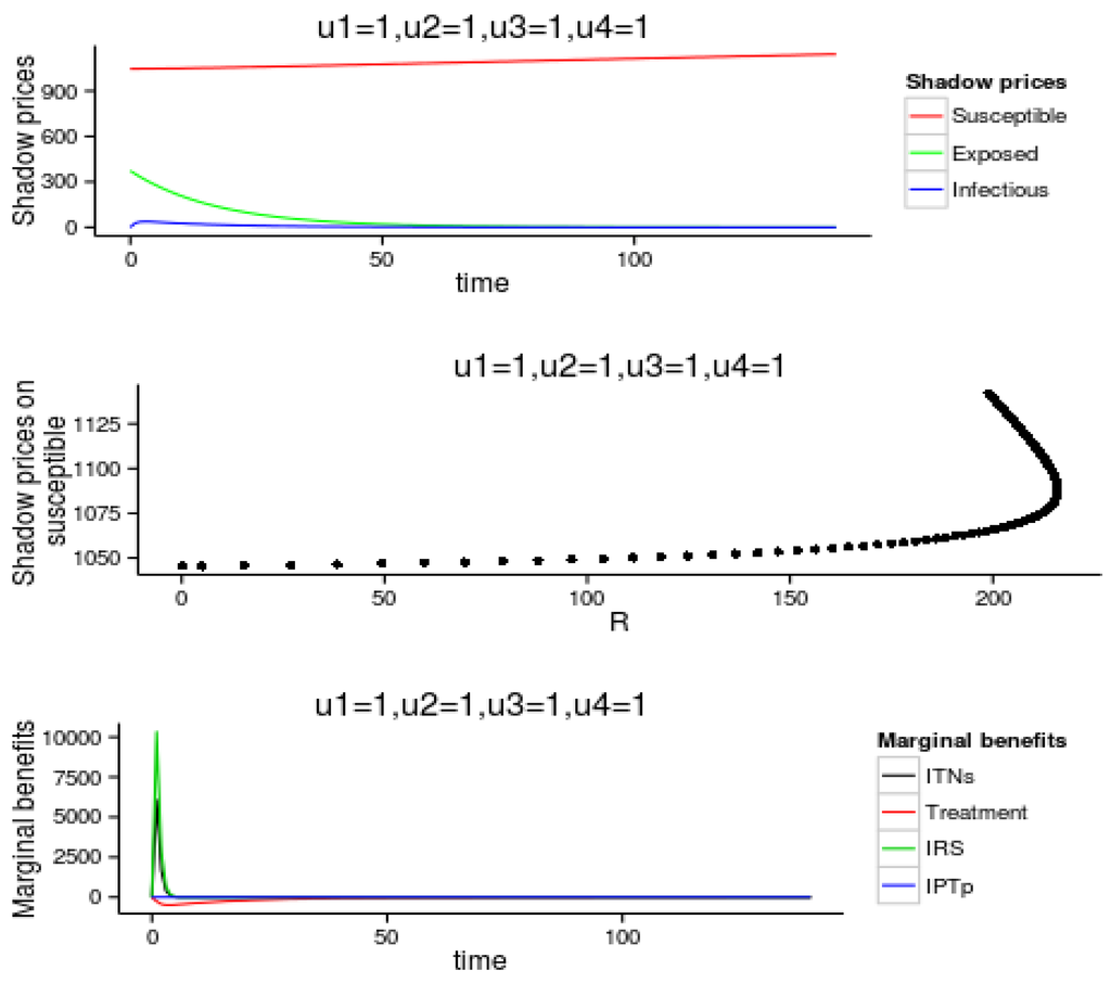 Across all the four malaria transmission settings, it is observed that the marginal value (shadow price) of is much less damaging than the marginal values of and . The shadow price on the susceptible humans are increasing overtime while the shadow prices of exposed starts dropping at days and shadow prices on infected starts dropping at days. In addition, across all the four malaria transmission settings, shows that the shadow price on starts at higher positive values, increases and stabilizes at higher prices closer to the total susceptible population. As more individuals recover from the disease the cost of the disease is still higher. It is also observed that across all the four malaria transmission settings shows that the marginal benefit of use of treatment is much smaller than the marginal benefit of IPTp, ITNs and IRS in that order. Smaller amounts of treatment is needed compared to IPTp, ITNs and IRS in that order to be able to eliminate the disease.