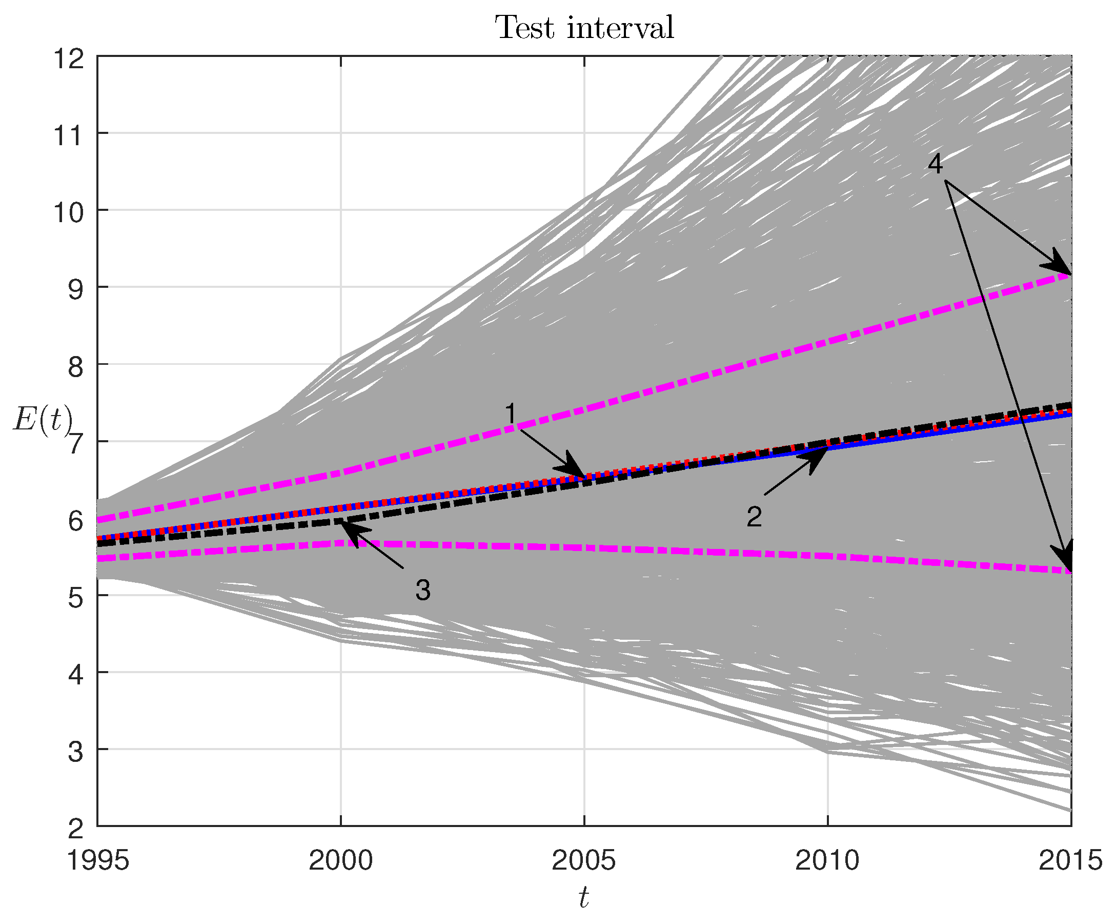 The test procedure yields the probabilistic characteristics of the parameters r, and ξ. It depends on the initial population size for the testing interval. Figure 3 shows the ensemble of the model-based trajectories for the parameter range from Equation (52) and the noise range from Equation (53), with a data-based selection of the initial point: