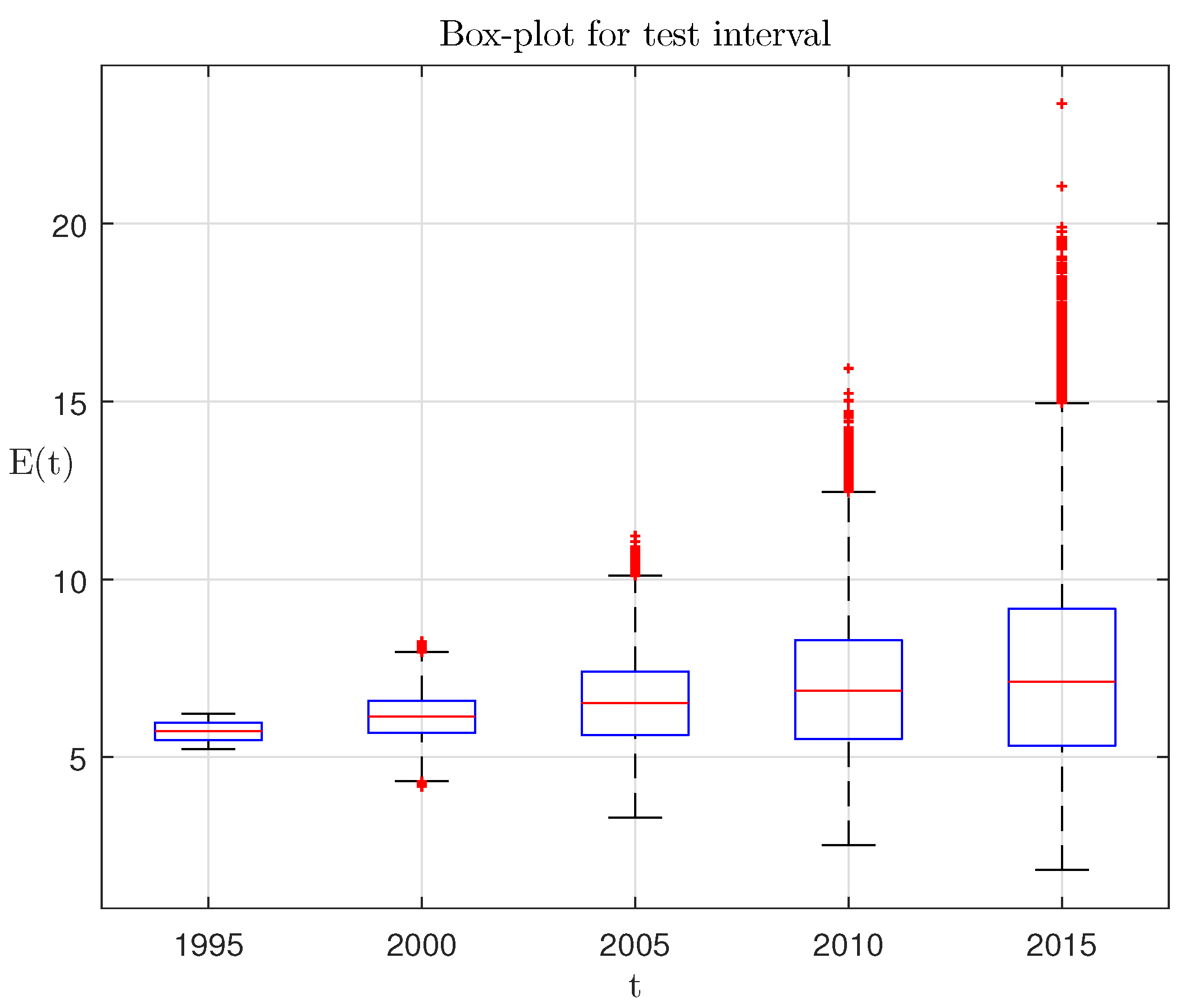 Figure 3 has the following notation: 1, the ensemble-average trajectories of population dynamics; 2, real population dynamics on the testing interval; 3, population dynamics on the testing interval according to the UN forecast of the year 1998; 4, the boundaries of the first and the third quartiles. The same model-generated ensemble for testing interval can be presented as a box plot with median mark and interquartile ranges; see Figure 4.