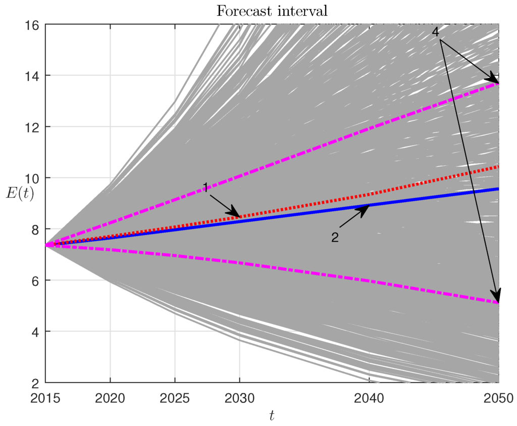 Sometimes, these characteristics assist in constructing the probabilistic characteristics of forecasting trajectories. The described technique will be termed probabilistic forecasting (PF) [9,10,11,12,13,14]. We emphasize that the above hypotheses regarding the stochastic properties of real datasets are almost impossible to verify, especially under small data arrays. It follows for the low efficiency of forecasts [15,16].