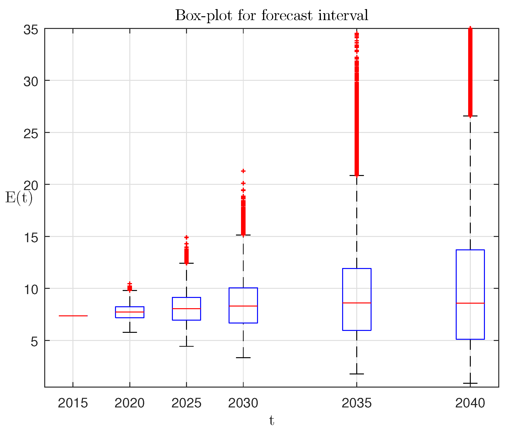 This simple RM has been applied to predict World population dynamics for the period from 2015–2050. The trajectory ensemble corresponding to the UN predictions (Table 3) is illustrated by Figure 5: 1, the ensemble-average trajectory; 2, UN projection; 4, the boundaries of the interquartile range (IQR zone). The corresponding box-plot is presented in Figure 6.
