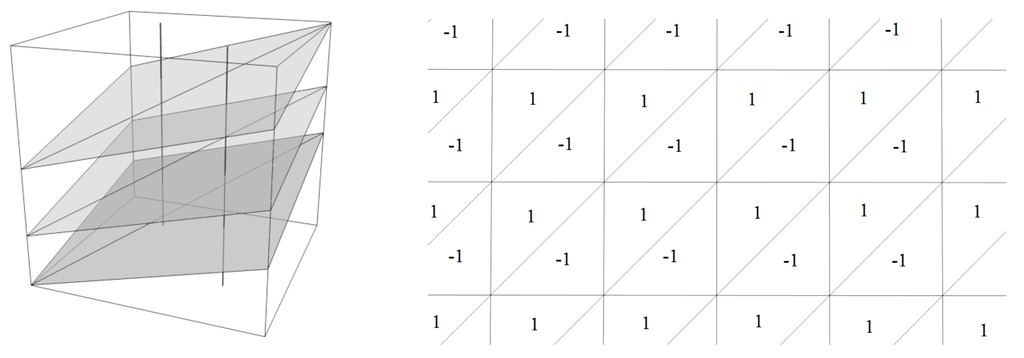 such that . The orientation refers to the orientation induced by the standard orientation of the canonical n-simplex in the domain of and to the inverse orientation. In order to relax the notation, we use only the notation b for signed barycenters and should denote the inverse orientation on the corresponding simplex. In this sense, we can define the set formed by the face barycenters of with a positive sign if the orientation agrees with the orientation in or negative otherwise. Analogously, we shall use the signed notation for oriented simplices, where will denote that simplex with the opposite orientation. Clearly, a measurable n-cochain is determined by the values on , in this sense n-cochains can be interpreted as measurable maps . This relaxed notation will be used only for the cases and . Let denote the set of simplicial n-cochains; this set is endowed with a group structure induced by R. We define the coboundary operator as usual by ,