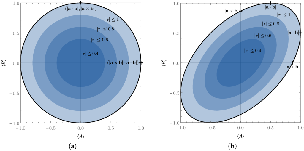 The ellipse delimited by the thick black line corresponds to the set of all permitted values for two fixed Pauli operators and with (a) and (b) for all possible states ρ, defined by the relation (12). The values on its boundary saturate Equation (12). The darker concentric ellipses represent the regions of permitted values for mixed states with bounded Bloch vector norms and , characterised using the first inequality in Equation (12).