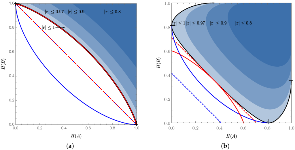 Analogous figure to Figure 2, with the uncertainty regions and relations now shown in the Shannon entropy domain, for (a) and (b) , i.e., for maximum overlaps and , respectively. The filled area corresponds to relation (41) (which is saturated for the values of on the thick black curve), with the darker areas representing values attainable for mixed states with bounded Bloch vector norms. The dashed blue and red curves correspond to the Maassen–Uffink bound (5) and to that of [18,19,20,21], respectively. In (b), the former is clearly suboptimal (it coincides with the latter only for ), while the latter is the optimal bound that can be put on the sum and is thus tangential to the uncertainty region characterised by Equation (41) (it touches it at the point for and on two symmetric points when ; the critical value corresponds to [19], or [21]). The solid blue and red curves correspond to the bounds (6) and (7), respectively, translated in terms of entropies using (see text).