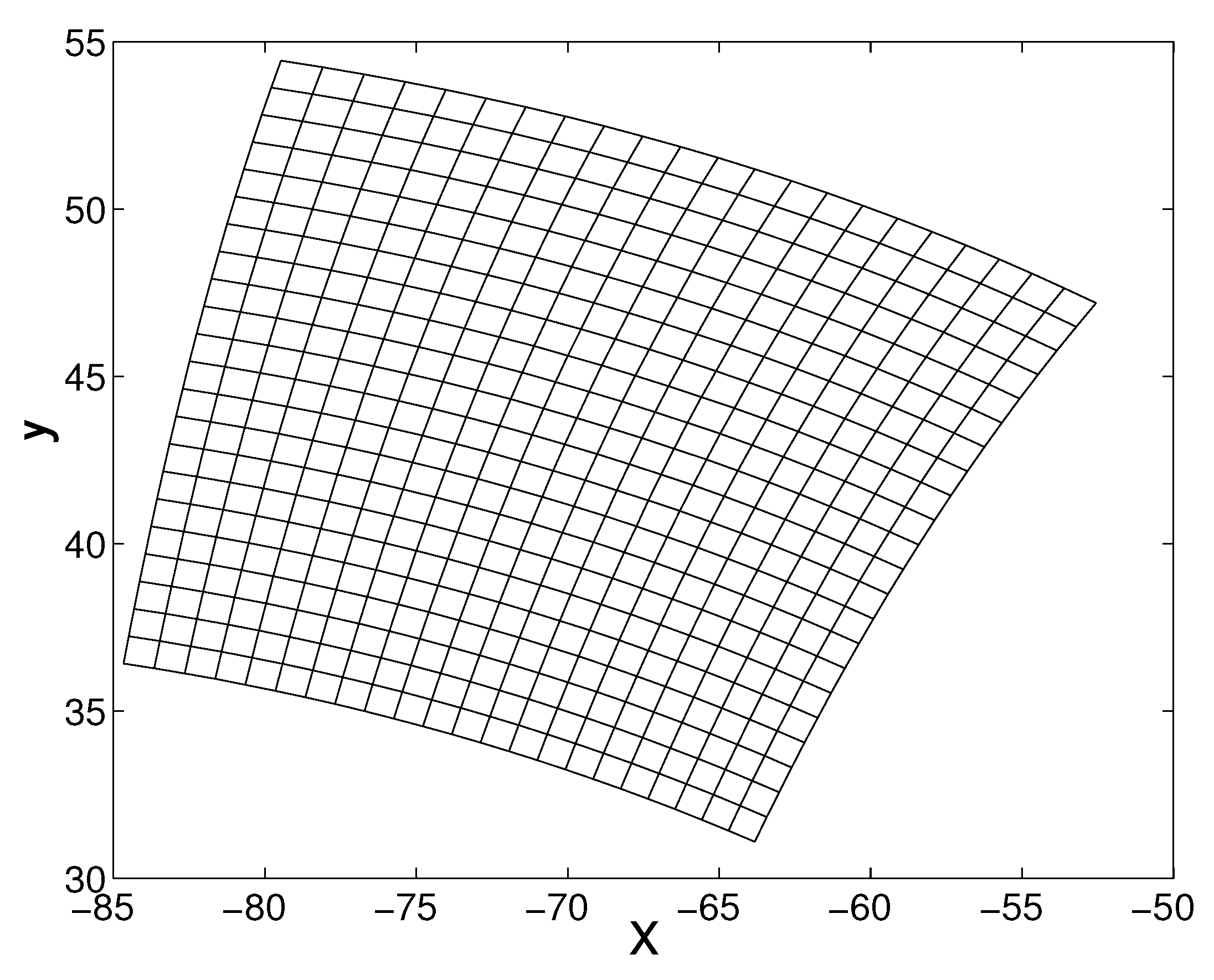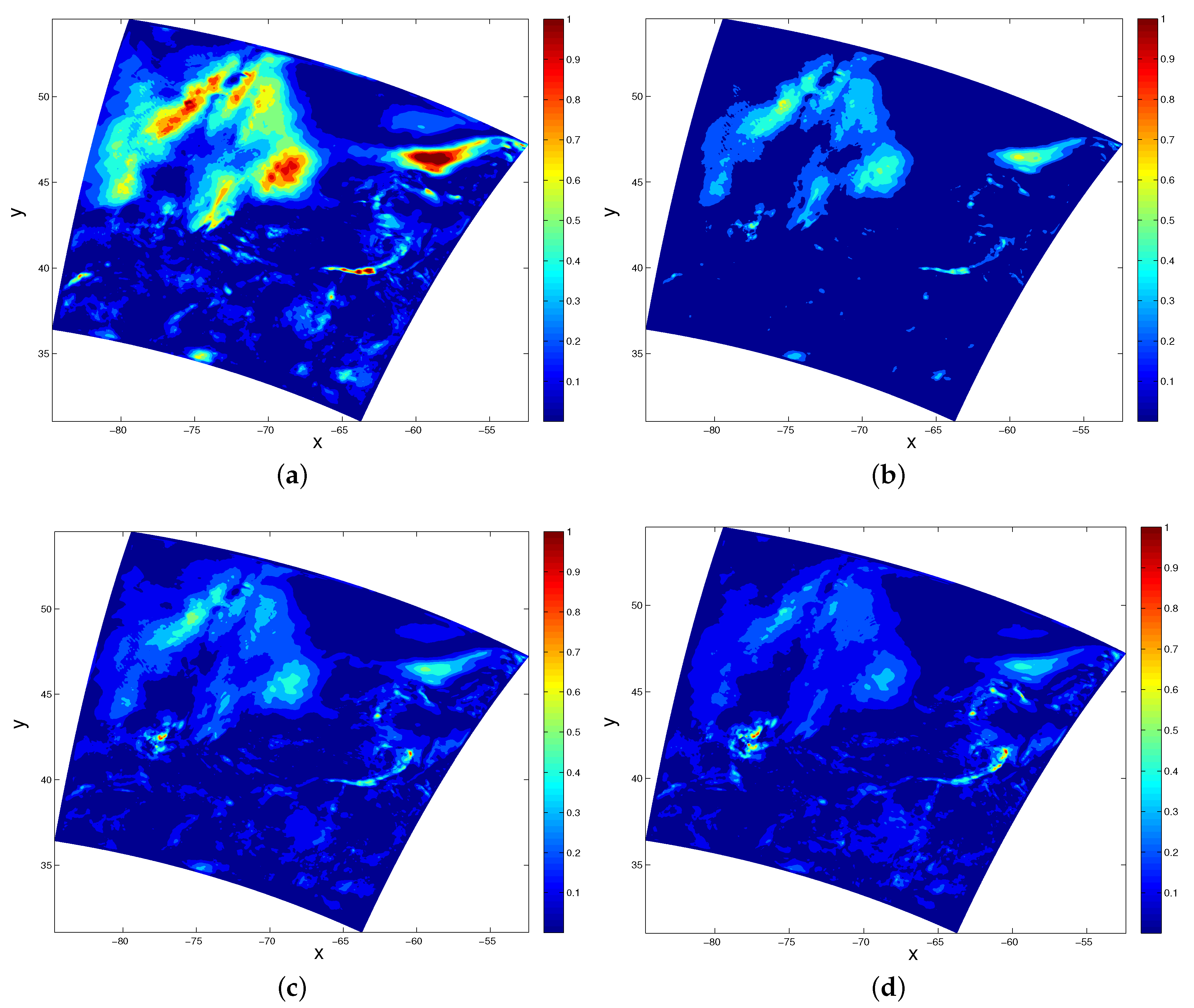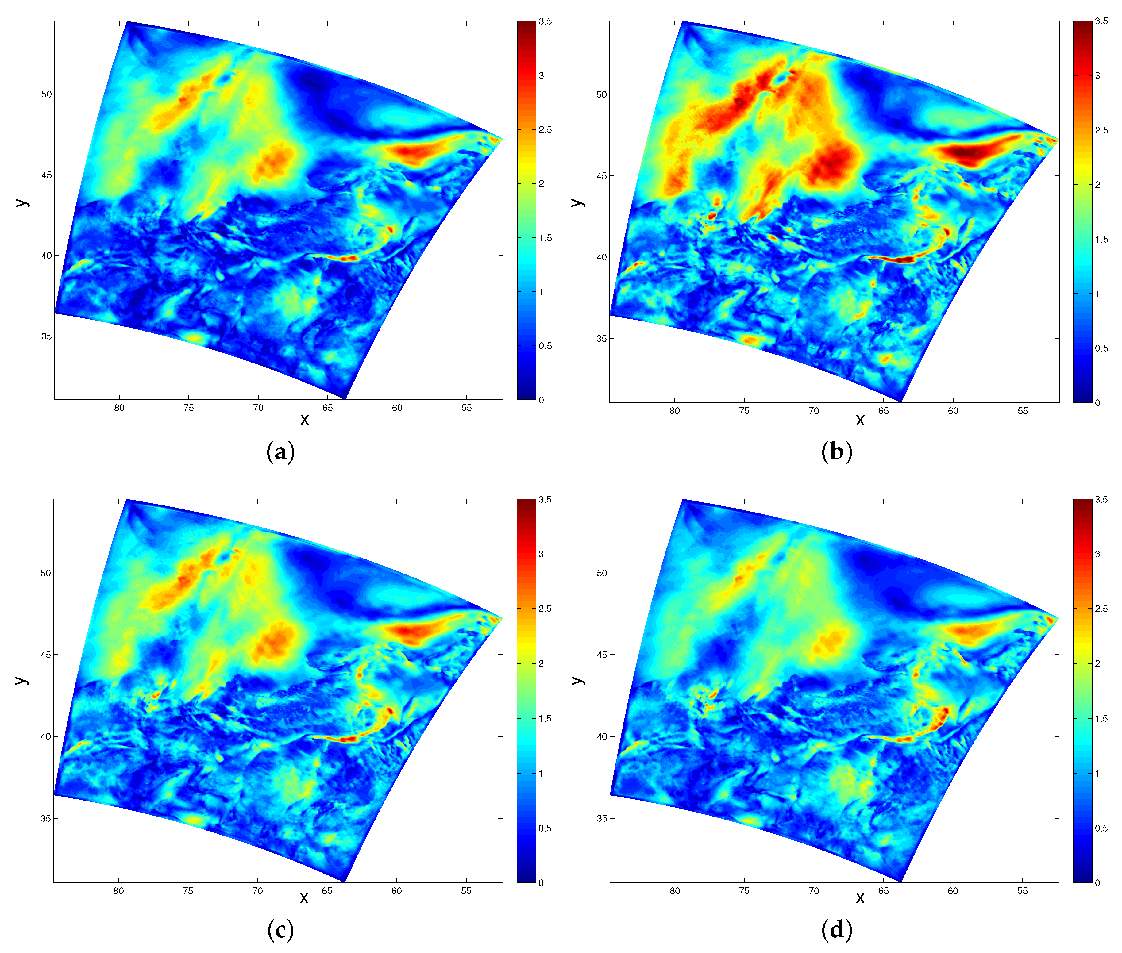 In this work, we use the 24 hourly spatial wind field simulation data sets in Maine Bay simulated from the Weather Research and Forecasting (WRF) model. The data we use contain 24 snapshots of the wind field within an area of about 35 km × 25 km from 13 July 2004 00:00 a.m. to 14 July 2004 00:00 a.m. The computation domain and grid are illustrated in Figure 1. The time difference between two successive snapshots is 1 h, namely, snapshot 1 corresponds to data on 13 July 2004 at 0:00 a.m., snapshot 2 corresponds to the data on 13 July 2004 at 1:00 a.m., etc. The temporal average of the window field is subtracted from the field, hence we concentrate on the fluctuation. By cross-correlating different snapshots obtained from the wind simulations, we construct the covariance matrix and its eigen-decomposition. From the eigen-decomposition, we obtain the POD eigenvalues and corresponding hierarchical modes. Here, we use Equations (2)–(6) to obtain Gappy-POD modes. We note that in [27], the procedure Equations (2)–(6) is iterated when the measurement data is incomplete. Here, we focus on complete data but with noise.