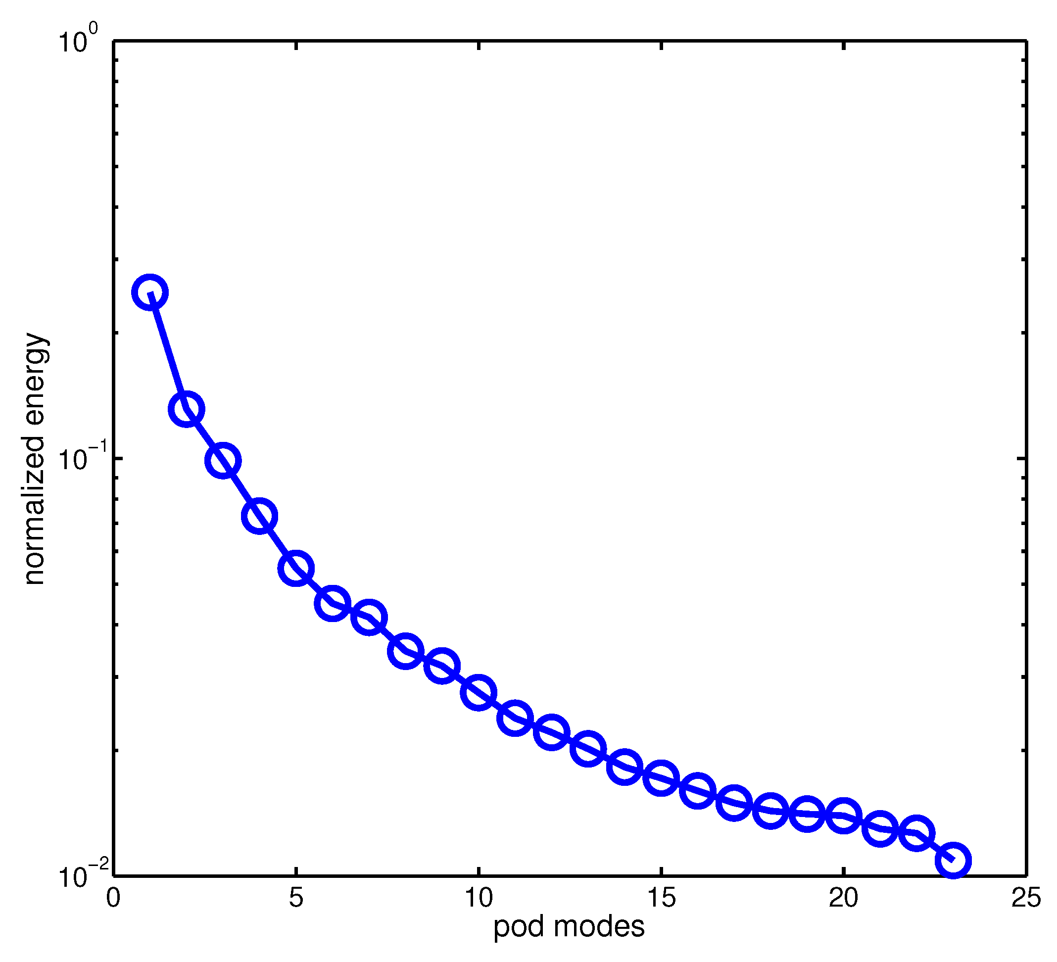 In Figure 2, we show the normalized POD eigenvalue spectra of total velocity. For illustration, in Figure 3, we show the contour plots of the first and second POD spatial modes for total velocity.