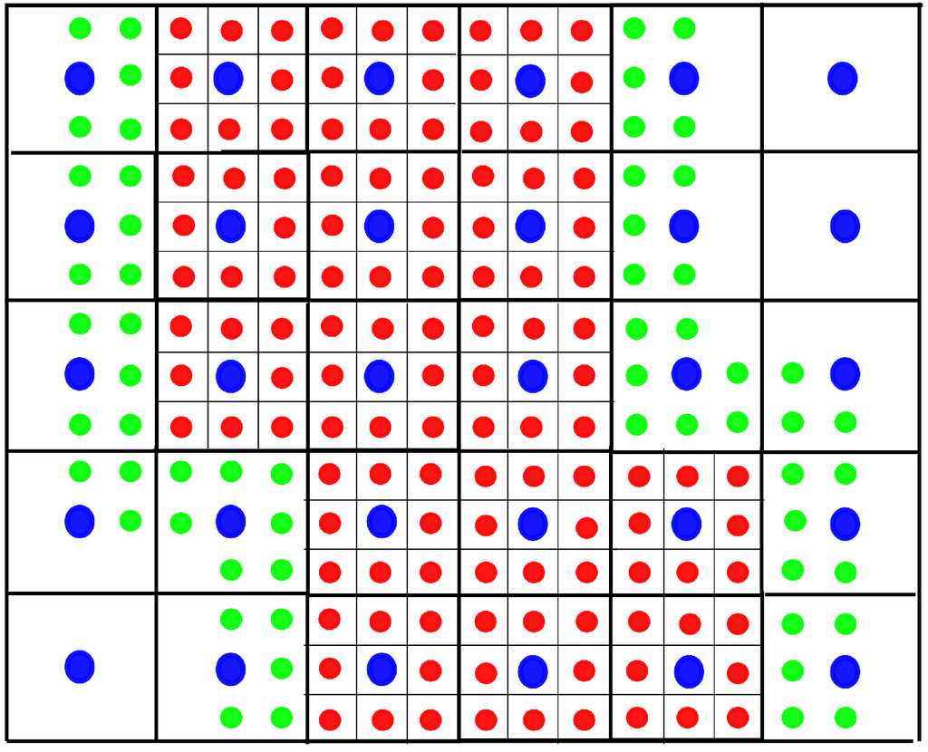 - Generate the WENO interpolating polynomial by applying the algorithm reviewed in Section 2.2. We start from the clusters with the finest mesh level. The needed boundary values in the WENO interpolation procedure can be either obtained from the neighboring cluster with same mesh level or interpolated from coarser clusters. Again, the WENO interpolation should be used in order to avoid the oscillations (see Figure 3; the green circles are interpolated from the blue circles on a coarser cluster).