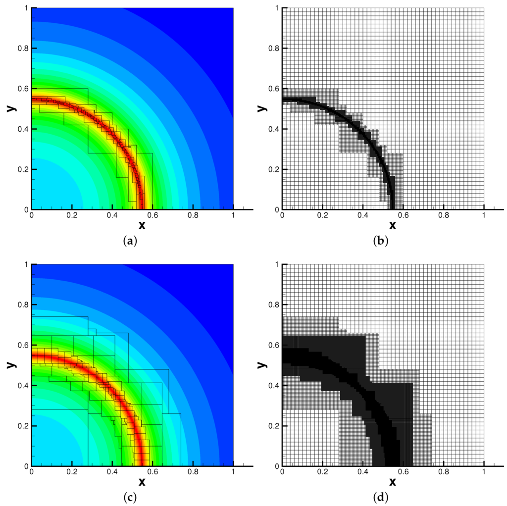- Shen, C.; Qiu, J.-M.; Christlieb, A. Adaptive mesh refinement based on high order finite difference WENO scheme for multi-scale simulations. J. Comput. Phys. 2011, 230, 3780–3802. [Google Scholar] [CrossRef]