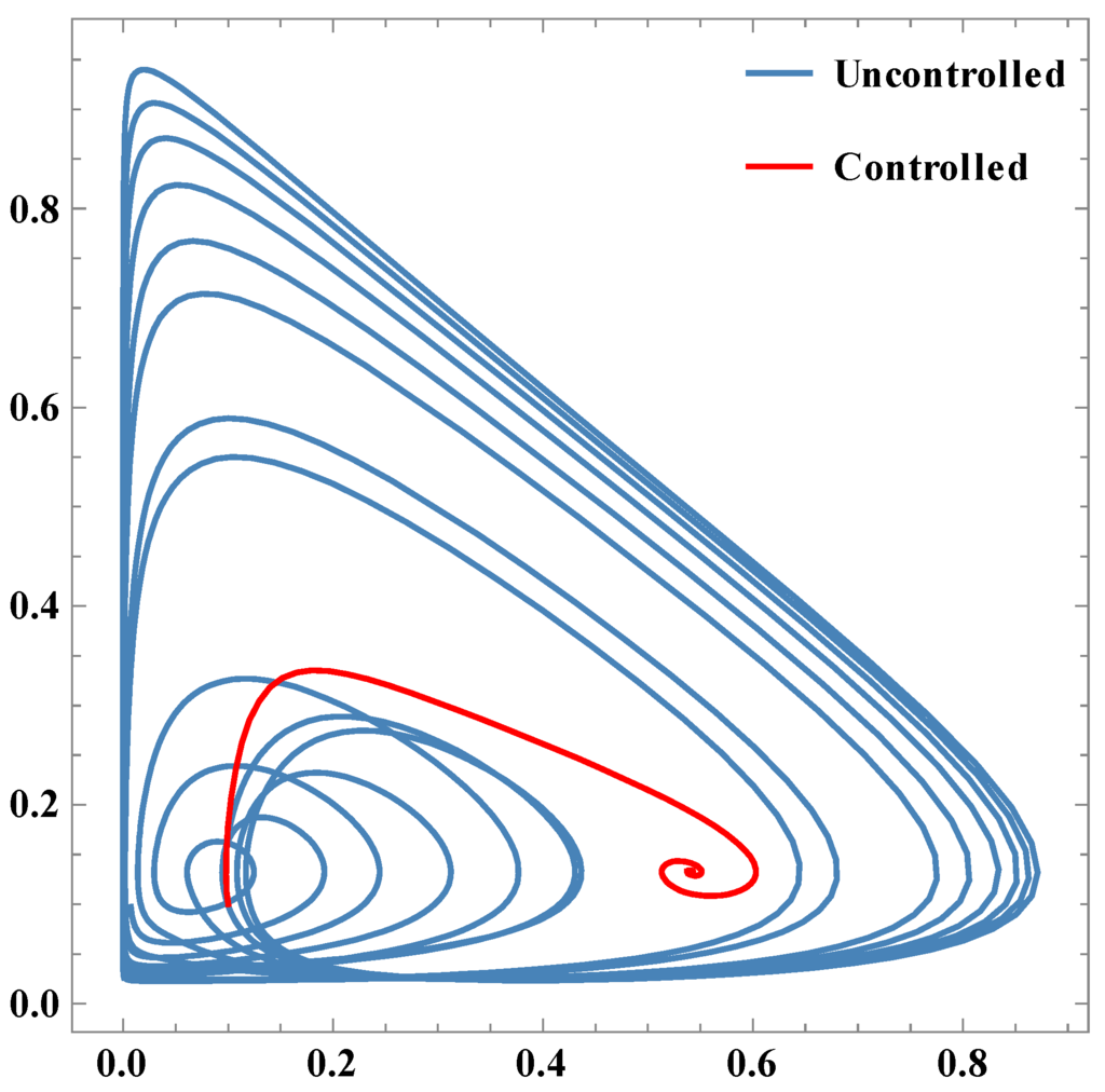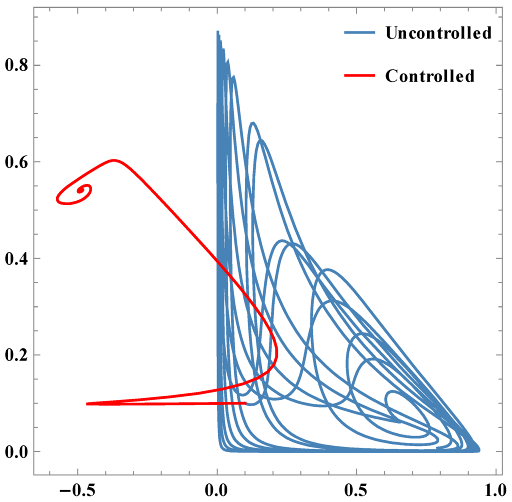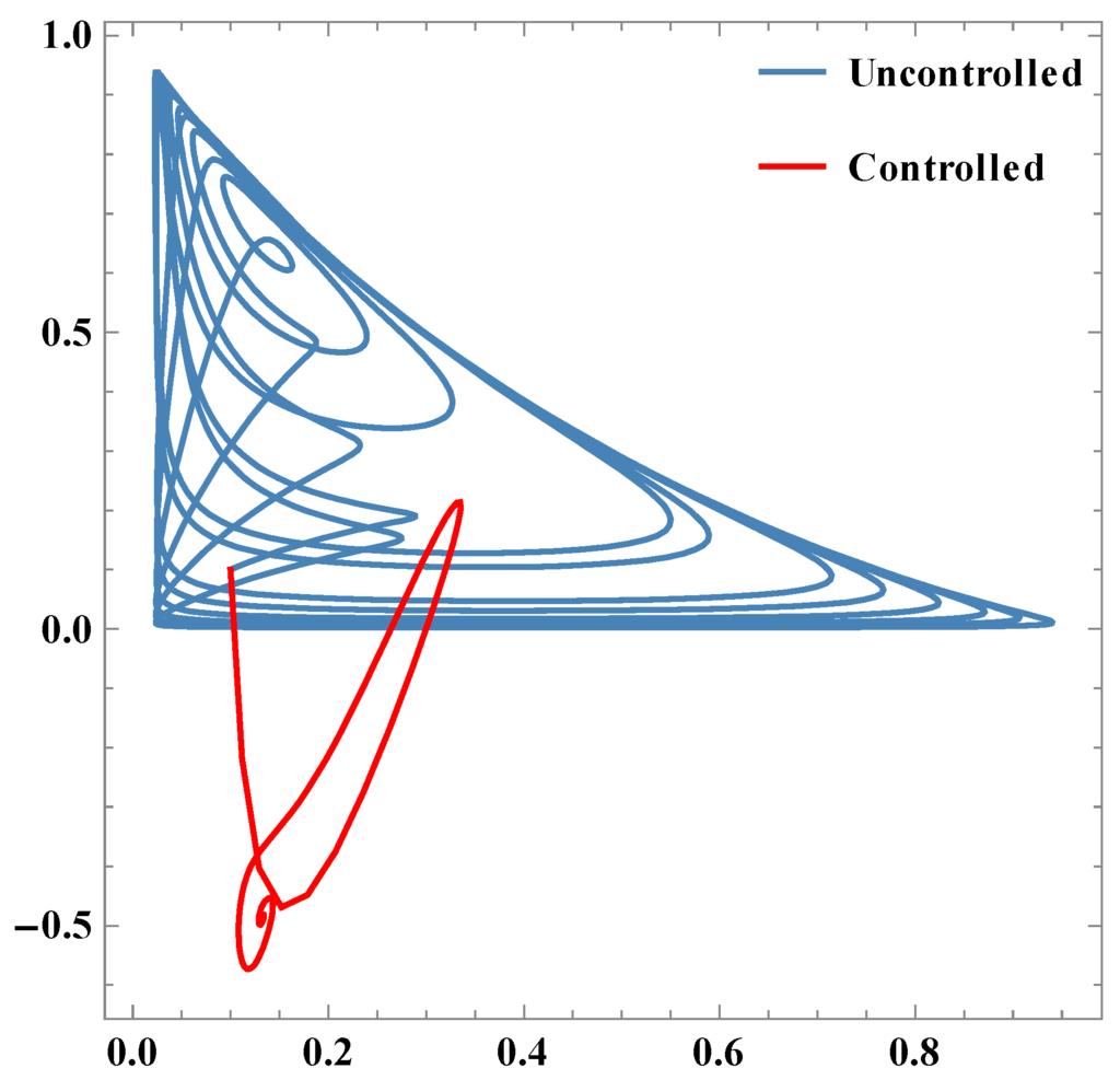 The system parameters involved in Equation (6) have been chosen as: A 12 = 1 ; A 13 = 2.5 ; A 21 = 1.5 ; R 2 = 0.6 ; A 31 = 0.2 ; R 3 = 4.5 ; k 3 = 1 ; D 3 = 0.5 with the initial conditions: T ( 0 ) = 0.1 ; H ( 0 ) = 0.1 ; E ( 0 ) = 0.1 , and for K = 1 ; a 1 = 0.1 ; a 2 = 0.9 ; a 3 = 0.6 , a controller given by Equation (19) is evaluated. Using Mathematica, the following different graphs have been plotted to show the robustness as well as effectiveness of the implemented technique. Figure 2 and Figure 3 depict the uncontrolled and controlled time series of the state variables of the system Equation (6), respectively whereas the phase plots (a graph between state vector & its derivative) of three state vectors are shown in Figure 4, Figure 5 and Figure 6 for controlled and uncontrolled one, respectively. Someone can observe that chaotic attractors are being replaced by regular ones as the controller is injected. Comparative parametric plots of controlled and uncontrolled state vectors pairwise and 3D have been sketched (Figure 7, Figure 8, Figure 9, Figure 10 and Figure 11).