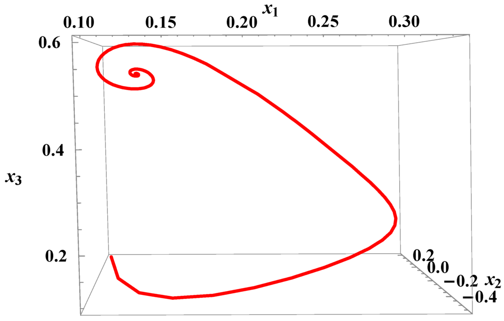 | M | = | 0 A 12 x 1 x 2 A 12 x 1 2 x 2 x 2 2 R 2 x 2 2 A 21 2 x 1 x 2 2 + 2 R 2 x 2 2 ( R 2 A 21 x 1 ) 0 0 A 21 x 1 x 2 { R 3 K 3 x 3 ( x 1 + K 3 ) 2 A 31 x 3 } | = A 12 2 x 1 2 x 2 3 x 3 ( R 3 K 3 ( x 1 + K 3 ) 2 A 31 ) 0 , for non-zero values of state variables involved in | M | . It is also confirmed by Figure 1.