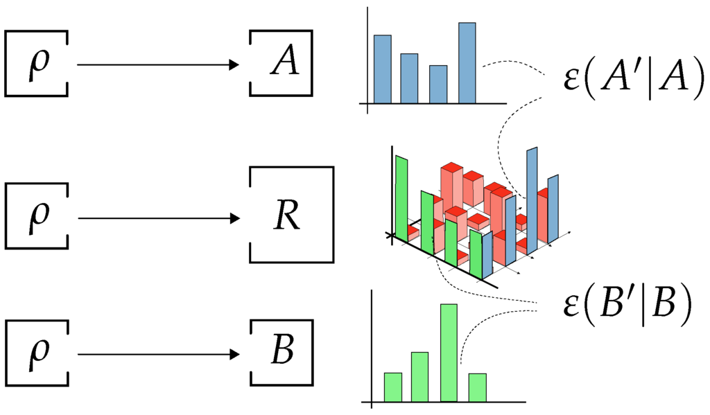 Basic setup of measurement uncertainty relations. The approximate joint measurement R is shown in the middle, with its array of output probabilities. The marginals and of this array are compared to the output probabilities of the reference observables A and B, shown at the top and at the bottom. The uncertainties and are quantitative measures for the difference between these distributions.