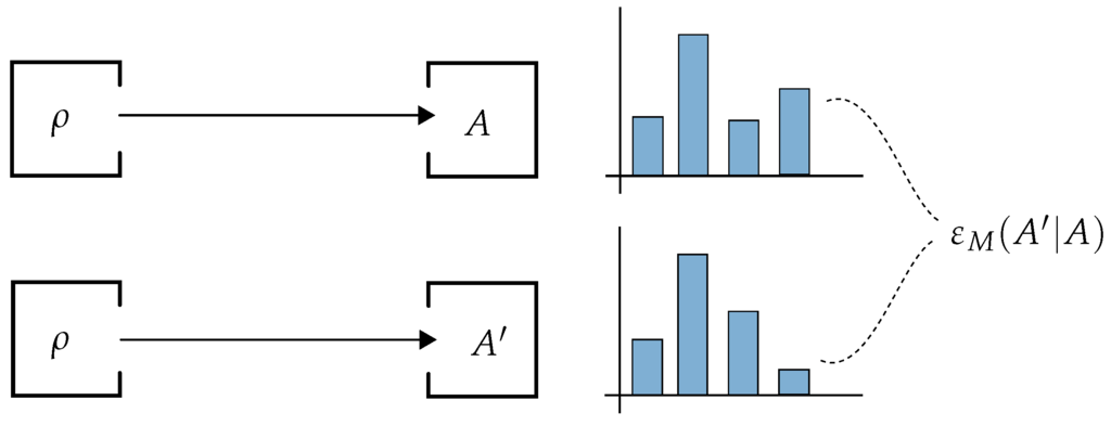 One can see that it is expensive to determine the quantity experimentally according to the definition: one would have to measure and compare (see Figure 3) the outcome statistics and for all possible input states ρ, which form a continuous set. The following definition of observable deviation alleviates this burden.