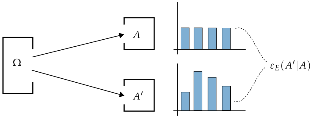 Here, we define the measures we use to quantify how well an observable approximates a desired observable A. In this section, we do not use the marginal condition Equation (1), so is an arbitrary observable with the same outcome set X as A, i.e., we drop all indices i identifying the different observables. Our error quantities are operational in the sense that each is motivated by an experimental setup, which will in particular provide a natural way to measure them. All error definitions are based on the same cost function , where is the “cost” of getting a result , when would have been correct. The only assumptions are that with iff .