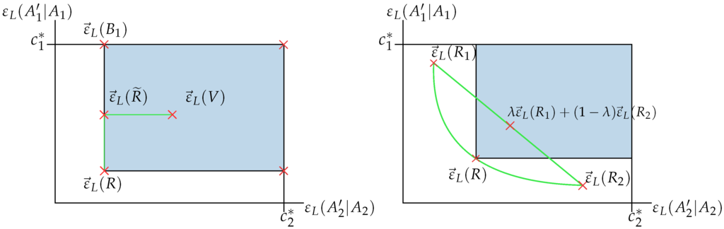 Let and be two observables, and let be their mixture. For proving the convexity of , we will have to show that every point on the line between and can be attained by a tuple of errors corresponding to some allowed observable (see Figure 6 (right)). Now, lemma 1 tells us that every component of is convex, which implies that . However, by monotonicity, this also means that is in again, which shows the convexity of . ☐