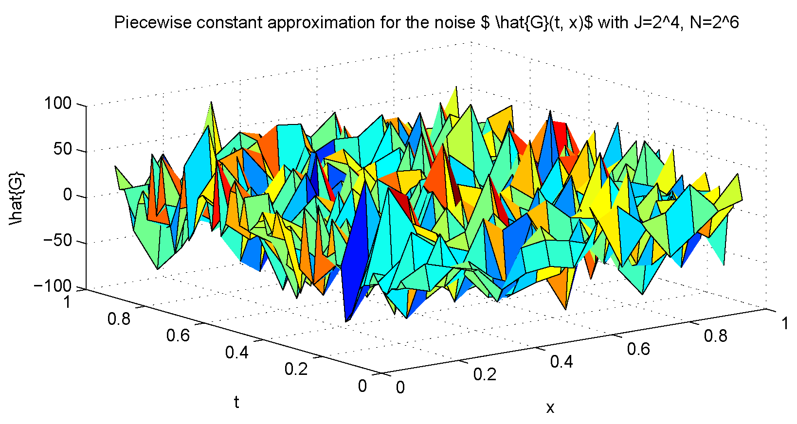 We note that Definitions (4) and (5) are not equivalent [17]. For the deterministic space-fractional partial differential equations where the space-fractional derivative is defined by (5), or the Riemann-Liouville space-fractional derivative, or the Caputo space-fractional derivative, many numerical methods are available, for example, finite difference methods [18,19,20,21,22,23,24,25,26,27,28,29,30], finite element methods [14,31,32,33,34,35,36,37,38,39,40] and spectral methods [41,42]. For the deterministic space-fractional partial differential equations where the space-fractional derivative is defined by (4), some numerical methods are also available, for example the matrix transfer method (MTT) [21,22,43] and the Fourier spectral method [44]. In this work, we will use Fourier spectral methods to solve the approximated stochastic space-fractional partial differential equations. The main advantage of this approach is that it gives a full diagonal representation of the fractional operator, being able to achieve spectral convergence regardless of the fractional power in the problem. Let be the space partition of and h the space step size. Let be the time partition of and k the time step size. To find the approximate solution of (1)–(3), we first approximate the space-time white noise by using a piecewise constant function defined by, with [12],