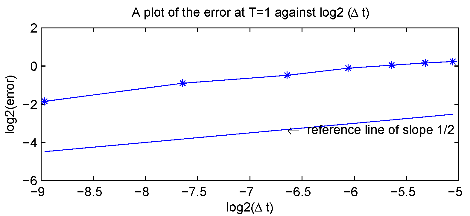 Since the convergence rate with respect to the time step is , i.e.,