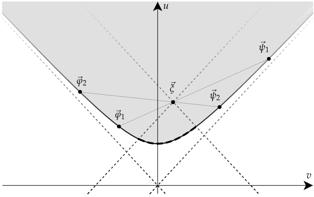 Cross-section () of the uncertainty region (shaded) illustrating the convexity of its boundary ; convex combinations of moment triples located on the hyperboloid (associated with pure Gaussian states with minimal uncertainty) reproduce any given moment vector inside the uncertainty region (the points must be outside of the “back-ward light-cone” of the point , indicated by the dashed segment of the hyperbola).