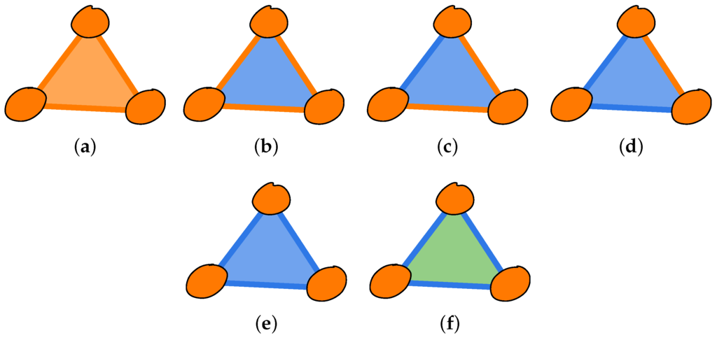 The simplest (non-trivial) example of a compatibility stack is the case of three vertices , , . A graphical representation of a compatibility stack is a triangle, where the edges and the area can be colored according to the corresponding index. The situation is depicted in Figure 2 for all possible compatibility stacks and in Figure 3 for some impossible cases.
