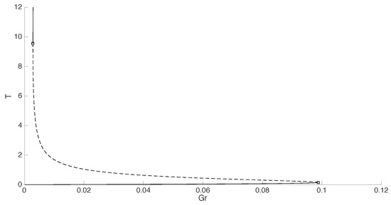 In addition to all that, after a second critical value of Lewis number, , which lies in the interval (0.7, 0.8) and is denoted by C in Figure 8, the upper branch becomes unstable right after the turning point, for . As in the case of the Hopf point curves, there exist a curve (denoted by green in Figure 8) and a curve (denoted by grey in Figure 8) which define an instability area in the upper branch.