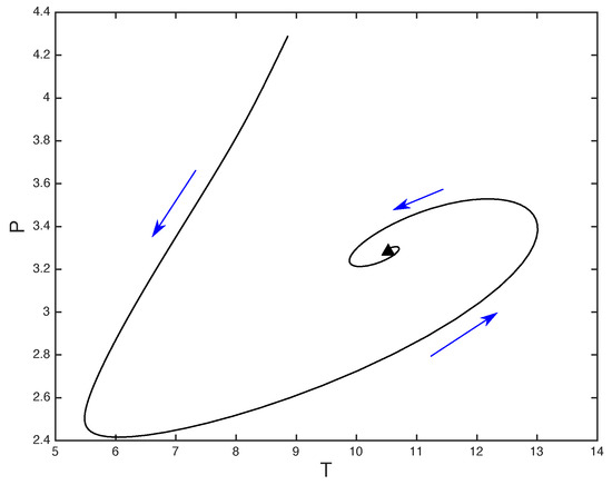 Phase diagram initial condition near the upper steady state for . The stable spirals presented here are representative of the dynamics near the upper branch for all .