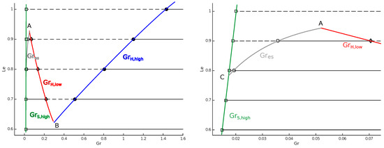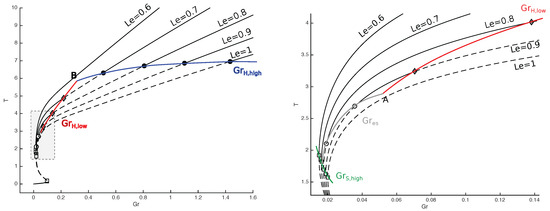 However, for a critical value of Lewis number, that lies in the interval (0.6, 0.7), denoted by point B in Figure 6, there appears a supercritical Hopf point in the Lewis space, which marks the onset of periodic solutions. From that point, two curves of Hopf points in Grunfest ( and ) are starting (denoted by red and blue in Figure 8). Those two curves are marking the boundaries of the periodic solution zone, from stable spirals outside (marked by solid black curves in Figure 8) to limit cycles inside (marked by dashed black curves up to point A in Figure 8).