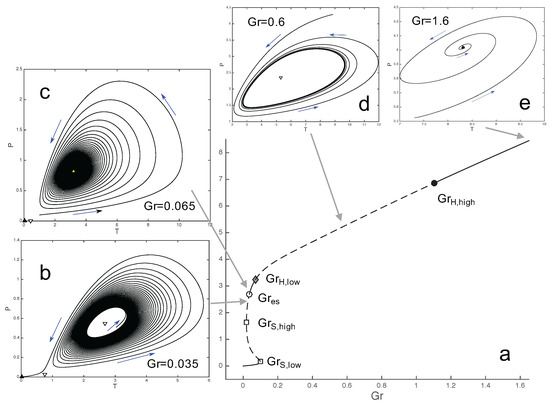 Numerical bifurcation diagram of normalised temperature at the centre of the shear zone with respect to (a) and phase diagrams for various Gruntfest numbers; (b) . Unstable spirals leading to the lower branch of steady state solutions; (c) . Stable spirals leading to the higher branch of steady state solutions (yellow triangle). In this case, the system is bi-stable, and there exists a domain in the phase space that leads to the lower branch; (d) . Stable limit cycles; and (e) Stable spirals. Note that the choice of Gruntfest numbers was made such that all areas of stability and dynamics modes of the upper branch of equilibria are represented.