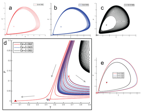 Phase diagram for near the homoclinic point. Based on our calculations, the first homoclinic point lies in (0.92, 0.93) × (0.062, 0.063) in the space. The diagrams (a–c) present the unstable spiral and the limit cycles for , respectively. In (d), a magnification of the trajectories near the origin is depicted. Note that trajectories for start from the same initial condition and reveal that starting from the right of the homoclinic point, the limit cycles increase in magnitude until they “touch” the unstable node of the middle branch and give rise to the homoclinic orbit. Finally, this transition from limit cycles to spirals through the homoclinic bifurcation is depicted in diagram (e).