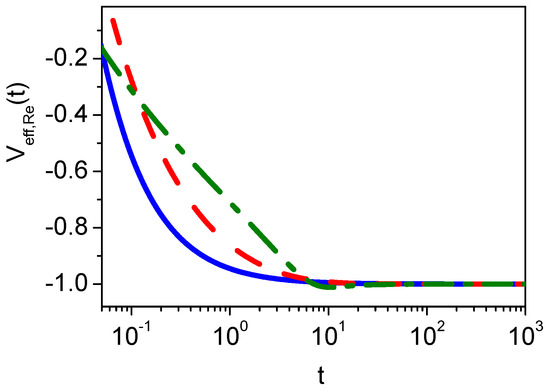A graphical representation of the real and imaginary part of the effective potentiall (14) for , ; (blue solid line), (red dashed line), (green dot-dashed line).