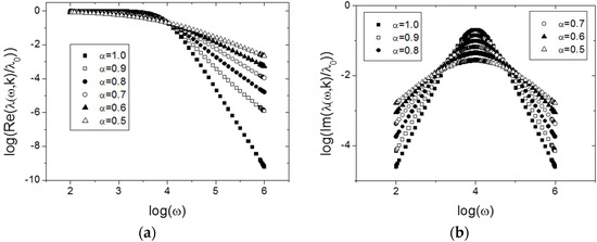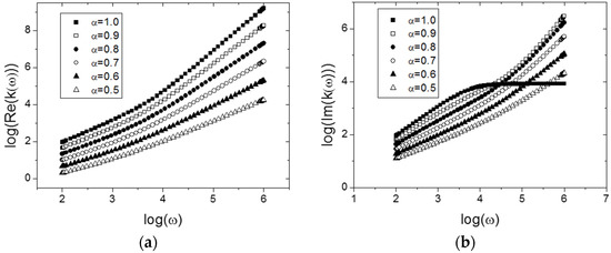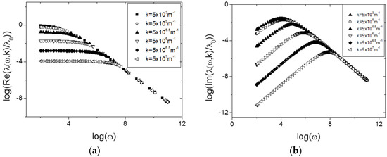 Variation of the generalization of the transport coefficient from Equation (27) for several values of , and with the relation in Equation (31): (a) real part of ; (b) imaginary part of . The parameters are the same as in Figure 2.