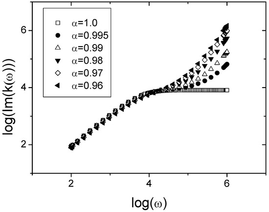 As we can see in Figure 2b, we have a limit behavior of the imaginary part of the relation. In order to clarify such characteristic in Figure 3 we plot Equation (31) for several values of the -parameter, from 0.96 to 1.0.