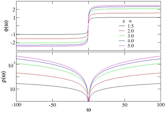 where the function is for and when . It is straightforward to prove that the expression (39) satisfies the Equation (37). Both functions are shown in Figure 2 taking , and several values of z.