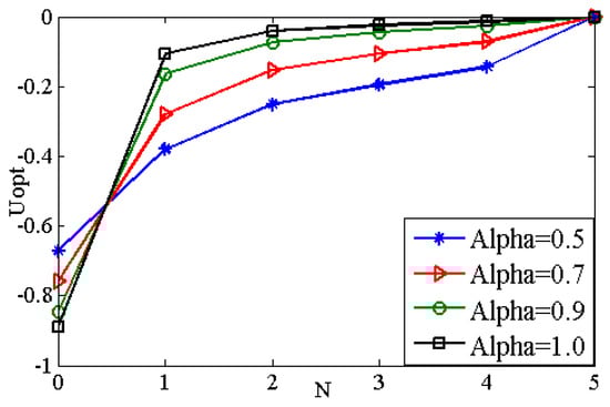 Using Equation (26) in Equation (25) we obtain the state vector . Then substituting into Equation (26) we get the co-state vector . Once is known, the control vector can be calculated using Equation (21). Solving the above equations we obtain the following results.