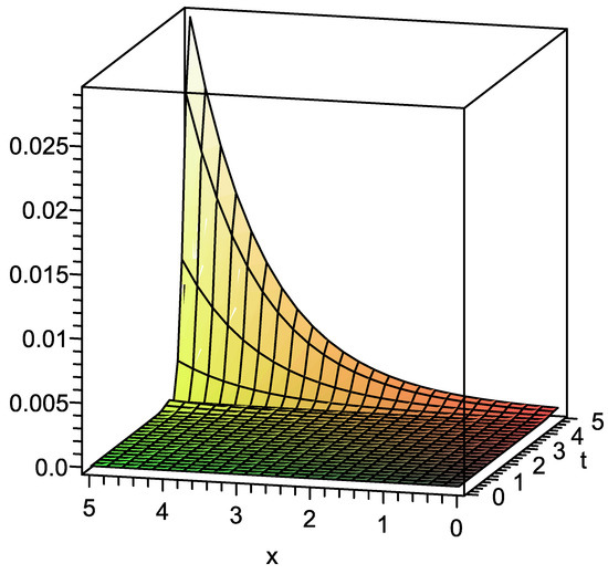 We apply a numerical integration to approximate . For obtaining an optimal value of h, we minimized by using Maple software (Waterloo Maple, Waterloo, ON, Canada). Figure 1 shows the two-dimensional variation of a seventh-order approximate solution with respect to and t for different values of . Figure 2, Figure 3 and Figure 4 describe absolute error for the 16th-order approximation by the present method for when , and . Table 1, Table 2 and Table 3 present the comparison between the absolute errors for 16th-order approximation by the present method and standard VIM for , and . The numerical results in Table 1, Table 2 and Table 3 show that the present method is effective in large domains, while the standard VIM is ineffective. Table 4 shows that in the proposed approach, the values of are close to zero compared to the standard VIM. Therefore, the present method has higher convergence speed than the exact solution to meet the standard VIM. Table 5 presents the maximum absolute error with some values of N and different values of . According to this table, increases in N decrease the arisen error of the approximation solution.