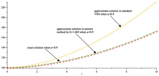 Plots of third-order approximation solutions by present method and standard VIM at for in Example 2.