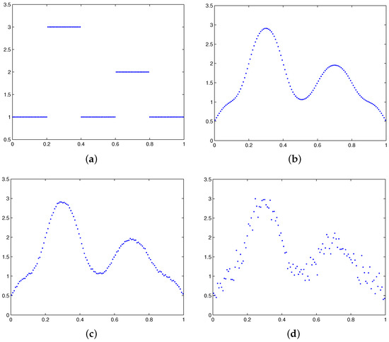 The exact solution, the right-hand side, and noisy right-hand sides for Example 2. (a) The exact solution; (b) the right-hand side; (c) a noisy right-hand side containing of white noise; and (d) a noisy right-hand side containing of white noise.