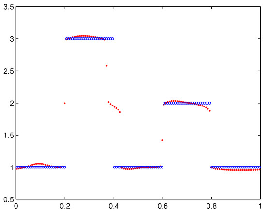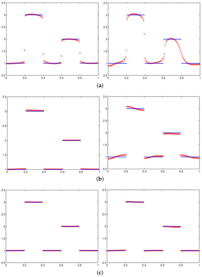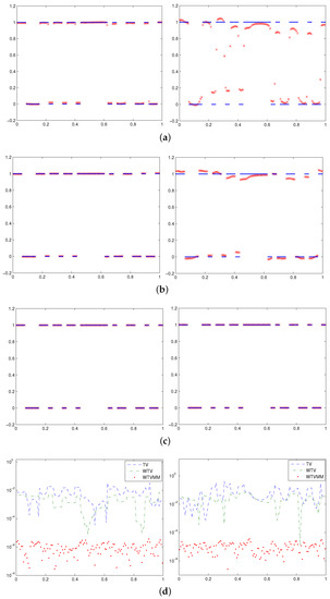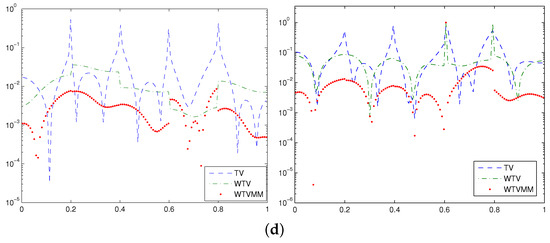 We set the number of subintervals to . All tests were carried out by using MATLAB, and the termination parameter is set to ; see Step 8 of Algorithm 1. In the tables, the column “” gives relevant parameters; the column “” gives the number of iterations (for the WTVMM method, denotes that the WTV method and the MM method require and iterations, respectively). The column “error” gives the relative error defined by: