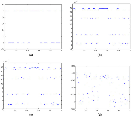 In our numerical tests, we choose . The intensity of the printed barcode and the exact right-hand side are shown in Figure 4a,b, and two noisy right-hand sides are shown in Figure 4c,d, respectively.