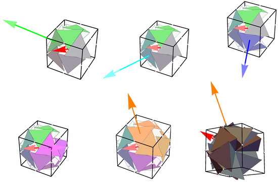 Action of spinors on the primal 5G: the primal 5G is rotated by the spinor given by Equation (9). This means each vertex (and hence, their position vectors with respect to the center) of each tetrahedron of the primal 5G is rotated by . The resulting tetrahedral cluster, along with the newly generated 5G shaded in green, is shown in the top left graphic of Figure 4. Consequently, other new sets of 5Gs are generated by the successive action of spinors, which are themselves generated by the rotation of their predecessors by the spinor as shown in the sequence of graphics in Figure 4. It must be noted that each generation of 5Gs shares some tetrahedral units with its predecessor.
